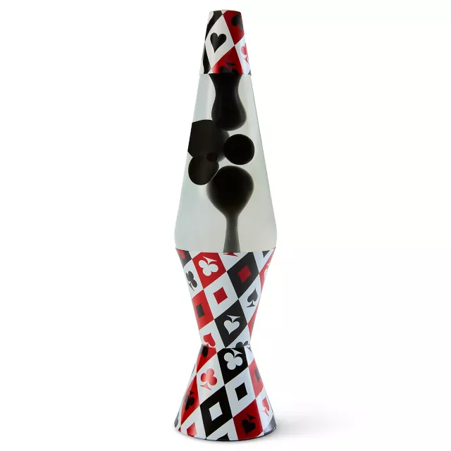 Shuffle up your decor game with this 17 Inch Playing Card Lava Lamp. With its stylish red, black, and white playing card-themed base, and mesmerizing black wax, this lamp is a perfect addition to your desk or any living space.