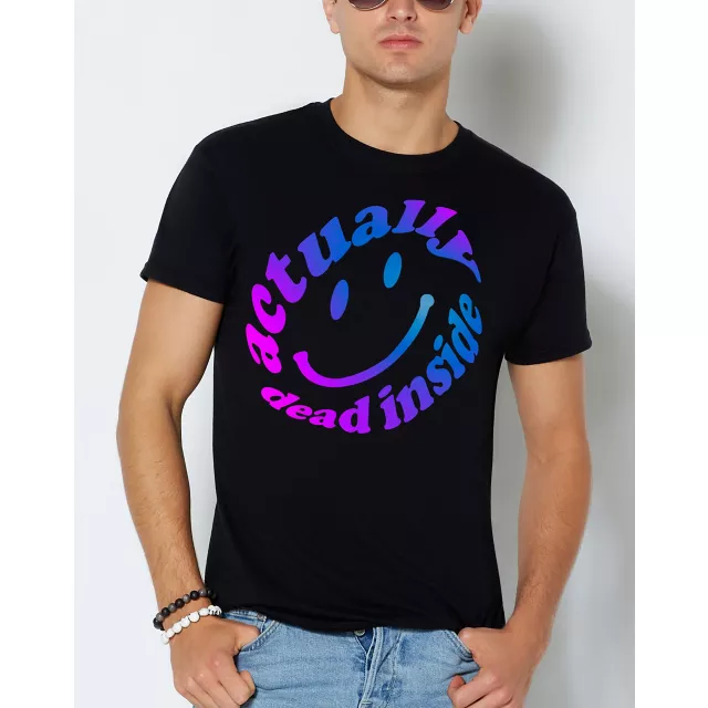 You may be smiling on the outside, but you're actually dead inside. We get it. This smiley black, blue, and purple Actually Dead Inside T Shirt will do the talking for you.