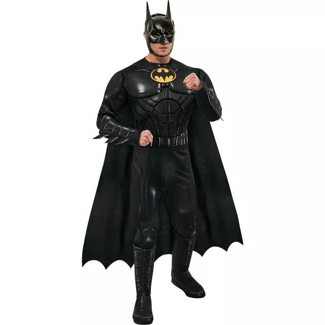 Transform into Batman in this officially licensed The Flash Batman costume! This action-packed costume includes a padded black jumpsuit with a yellow Batman chest emblem. Attached arm gauntlets and boot covers add authenticity to this movie-quality style. A belt, a black cape, and a molded plastic mask complete this heroic ensemble!