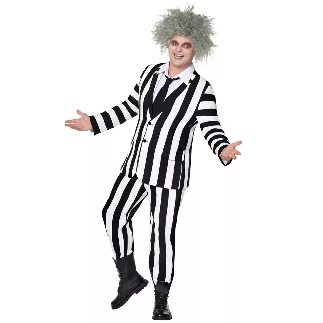 Everyone will instantly recognize you're the infamous Beetlejuice when you decide to dress up in this officially licensed Adult Beetlejuice Striped Plus Size Suit. Once you slip into this suit you'll look like you've just come off of the screen! You'll love dressing up as your favorite character with this costume that features a striped suit, pants, and a tie.