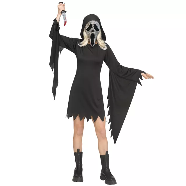 You might be dressing up as a grizzly slasher, but that doesn't mean you have to sacrifice style. Prepare to spread terror this Halloween when you rock this officially licensed Bling Ghost Face Dress Costume. Featuring a dazzling version of Ghost Face's iconic mask and a black hooded dress, this outfit has everything you need to horrify your friends, family, and neighbors!