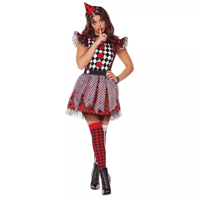 Prepare to put on the clown performance of your lifetime this Halloween in this Circus Misfit Clown Costume. Featuring a stylish dress with a white and black diamond pattern top and a red polka dot skirt, in this clown outfit you'll be ready to get into all kinds of mischief this Halloween in style. Complete the look with the included thigh high socks and you'll be the star of any circus.