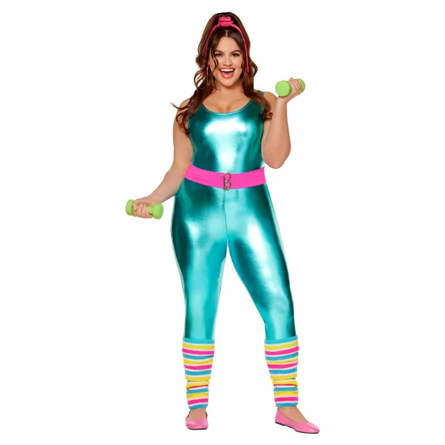 Head to aerobics class like it's the '80s in this officially licensed Classic Barbie Plus Size Aerobics Catsuit Costume! This adorable costume features a metallic turquoise catsuit with a pink Barbie belt, a pink hair scrunchie, a pair of pink hoop earrings, and multi-colored leg warmers!