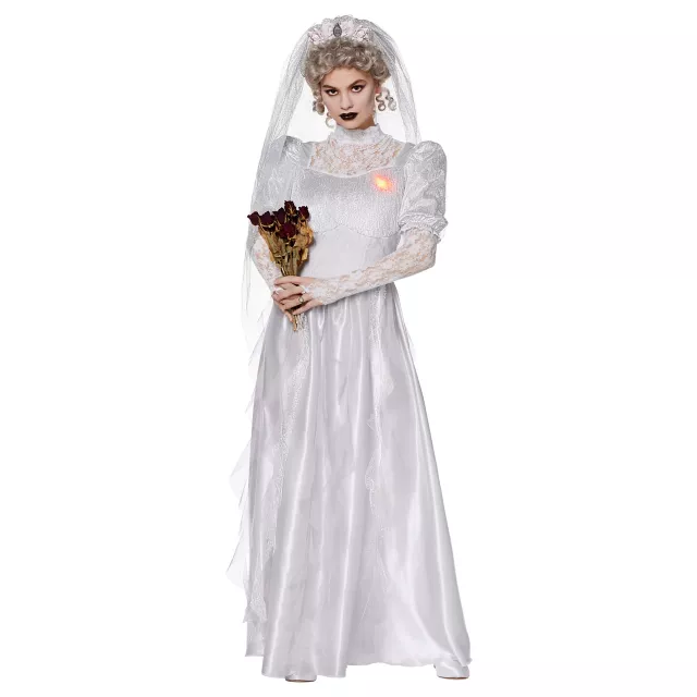 Till death do us part! This Halloween, channel your inner Black Widow Bride with this officially licensed Adult Constance Hatchaway Costume. This hauntingly beautiful bridal ensemble features a white lace dress with a glowing heart and an accompanying veil that's sure to impress even the most devoted Haunted Mansion fan!