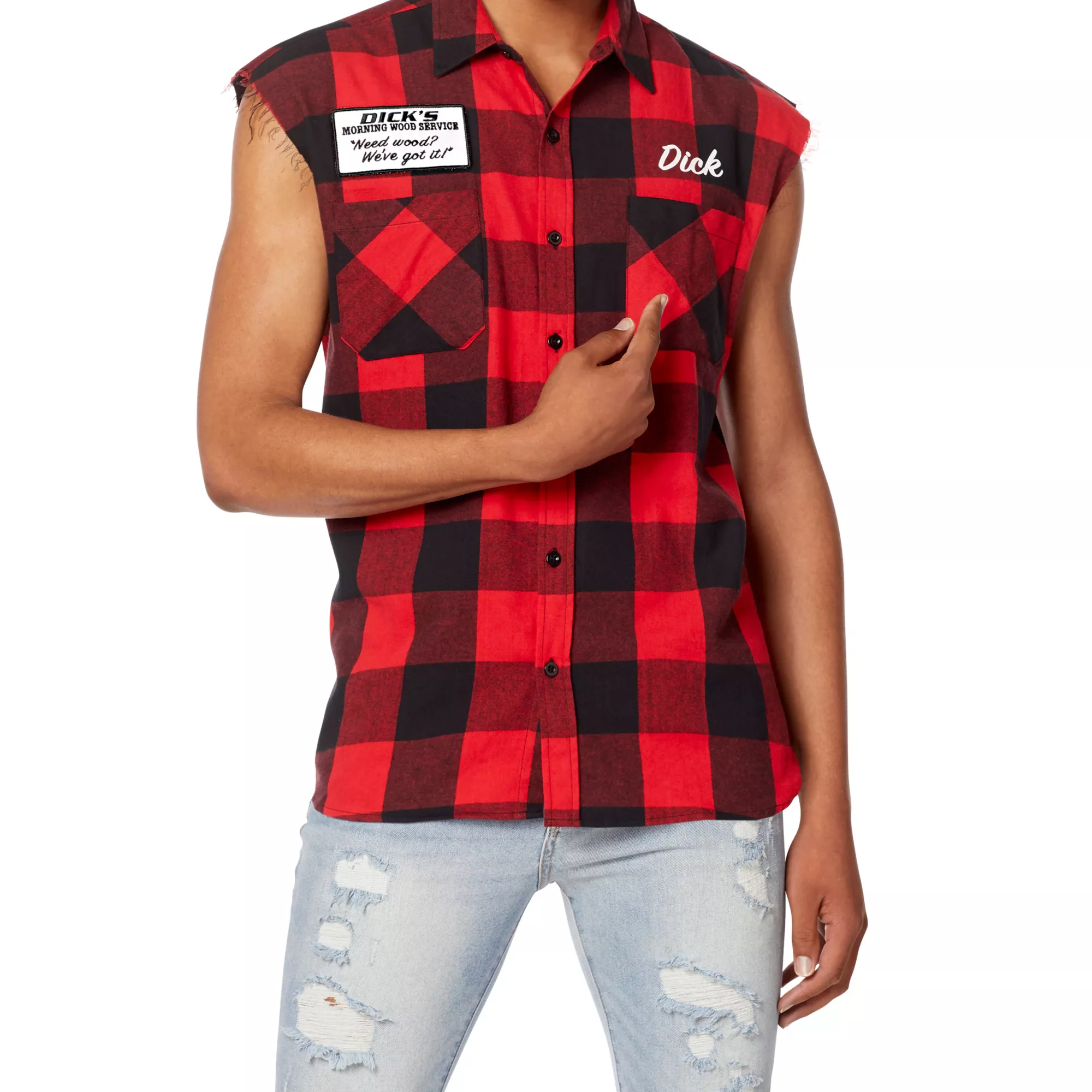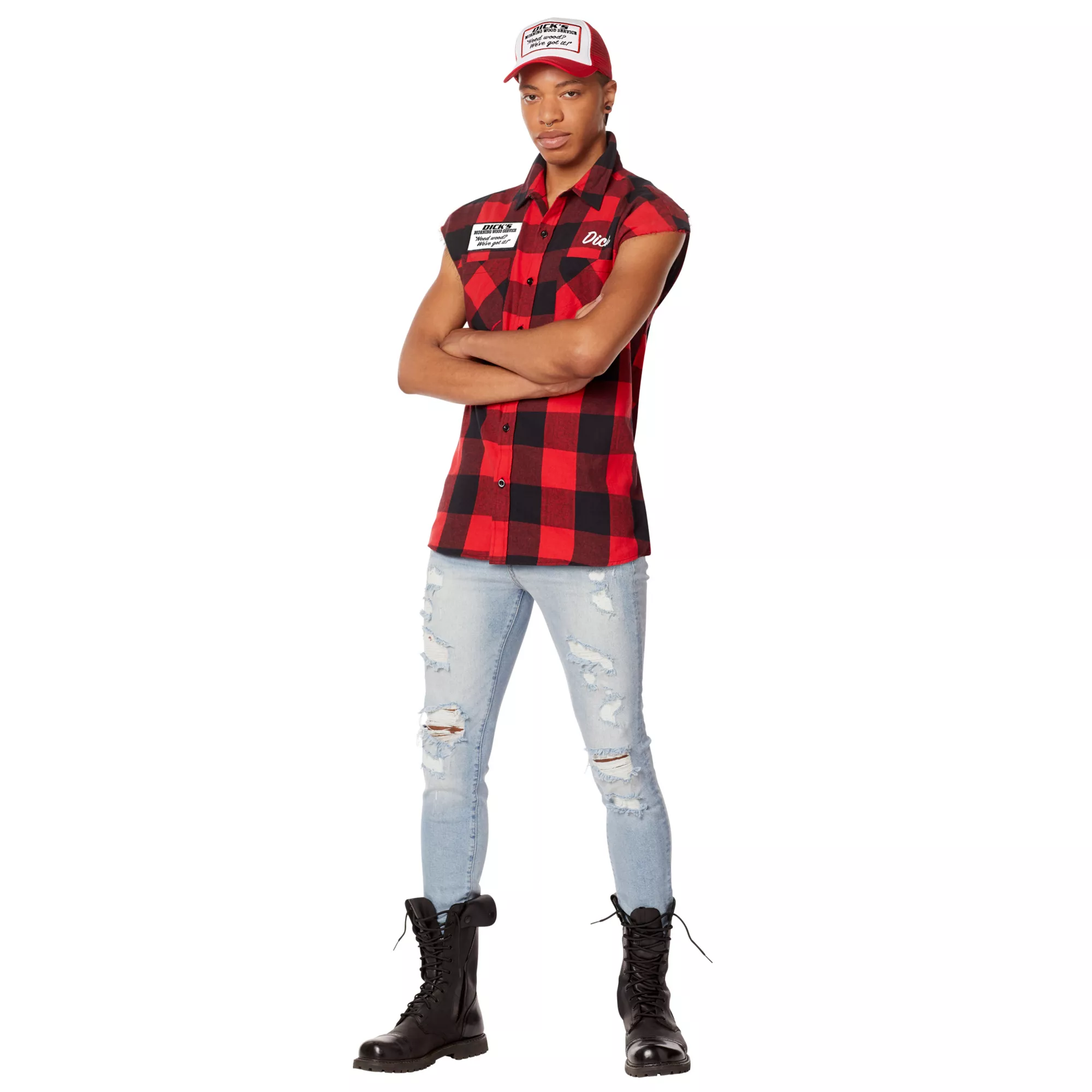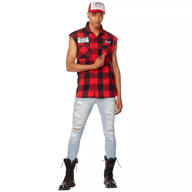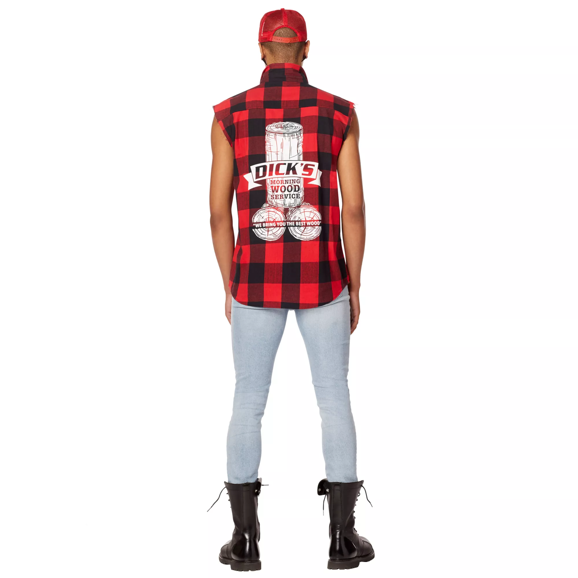 Bring around the best wood this Halloween when you dress up in this Adult Dick's Morning Wood Service Vest. This hilarious plaid vest features a Dick's morning wood service logo on the back and is the perfect start to any lumberjack or redneck costume. You're sure to get plenty of laughs when you sport this red plaid vest at the costume party this Halloween.