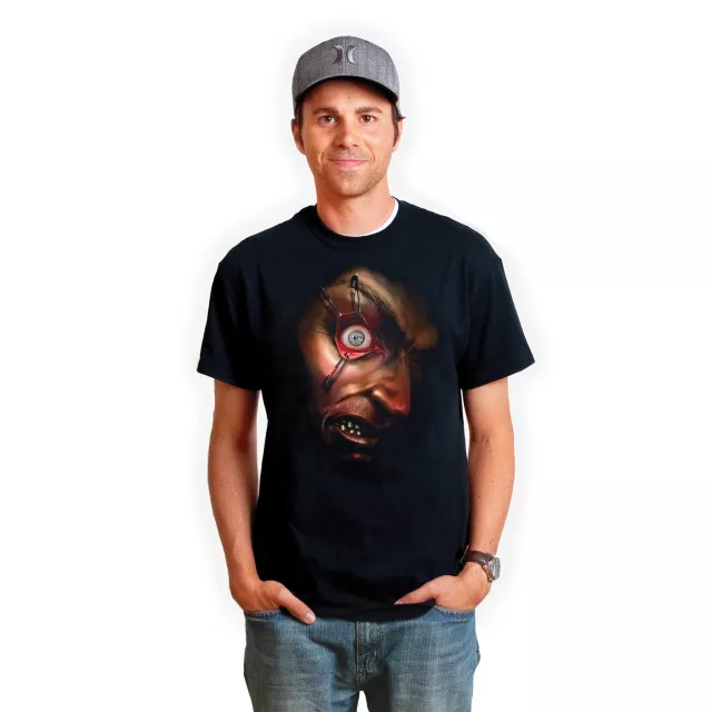 Anyone who crosses you when you're dressed in this Digital Dudz Safety Pinned Adult T-Shirt Costume will want to sleep with one eye open! This Frantically Moving Eyeball Black T-Shirt features a graphic of an eye safety pinned open and a hidden pouch for your mobile device. Purchase comes with a free mobile app download that, when combined with this tee, will surely freak them all out!