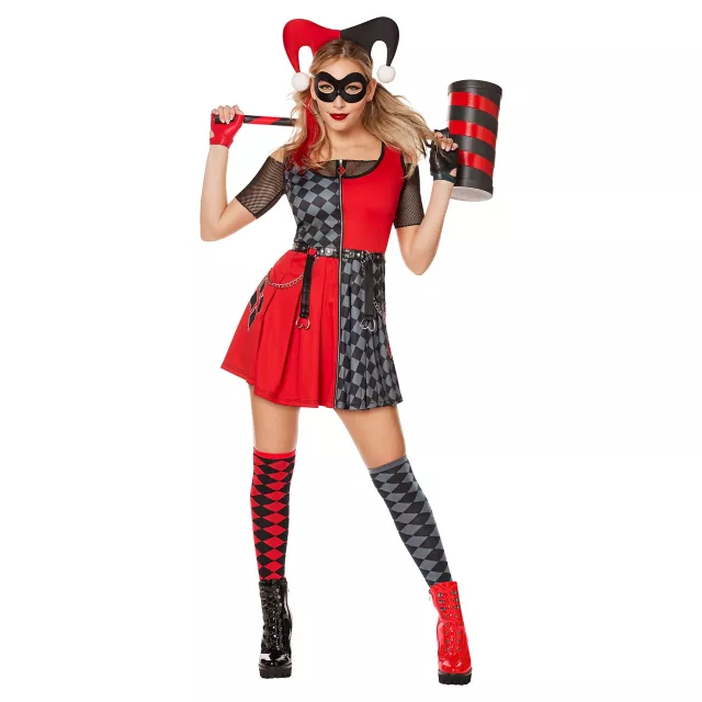 Stir up some chaos all over Gotham City when you dress up in this officially licensed Harley Quinn Costume! Featuring a black and red dress, a matching hat, an eye mask, and a pair of black socks, this outfit includes everything you need to become the legendary DC Villain. Gear up and get ready to raise hell.