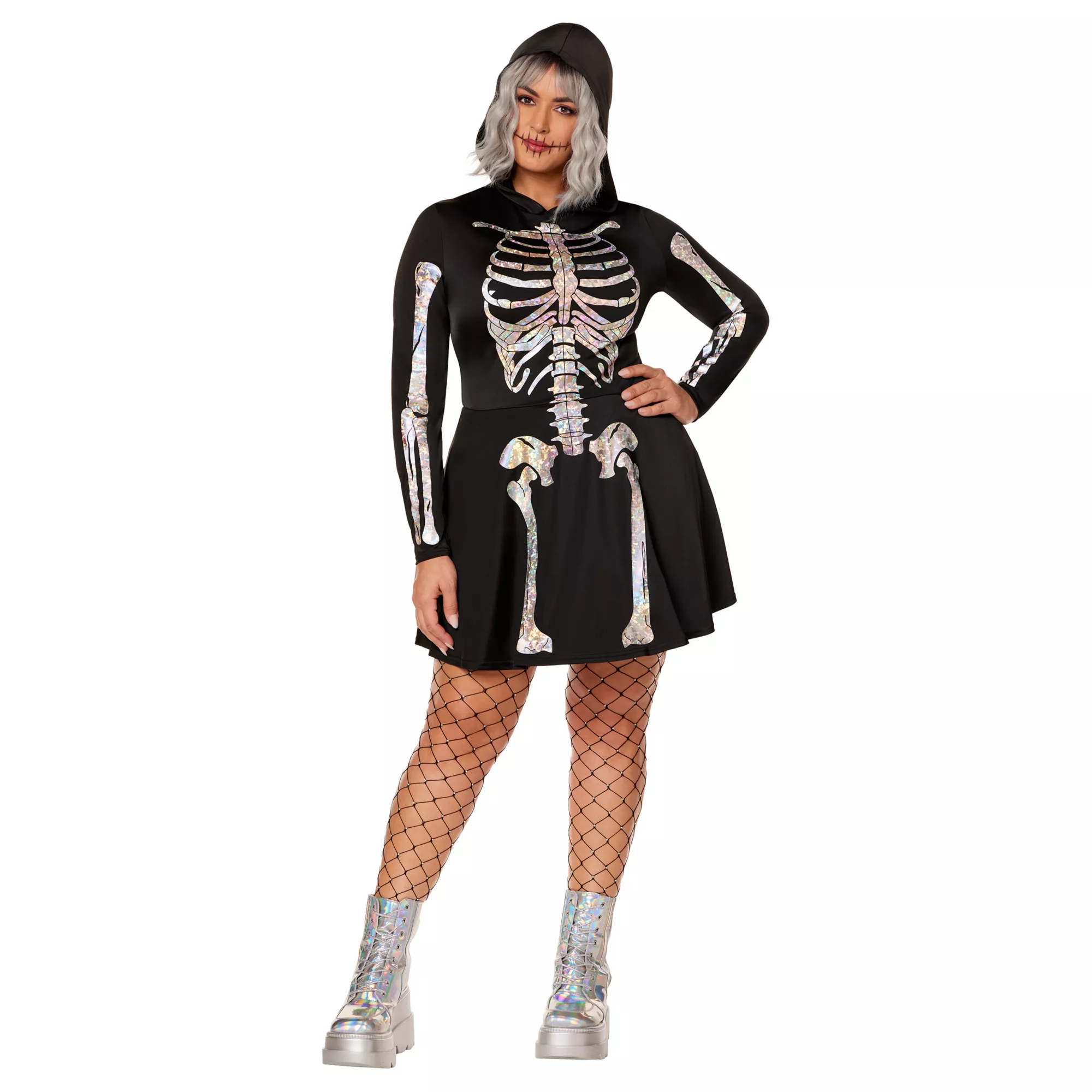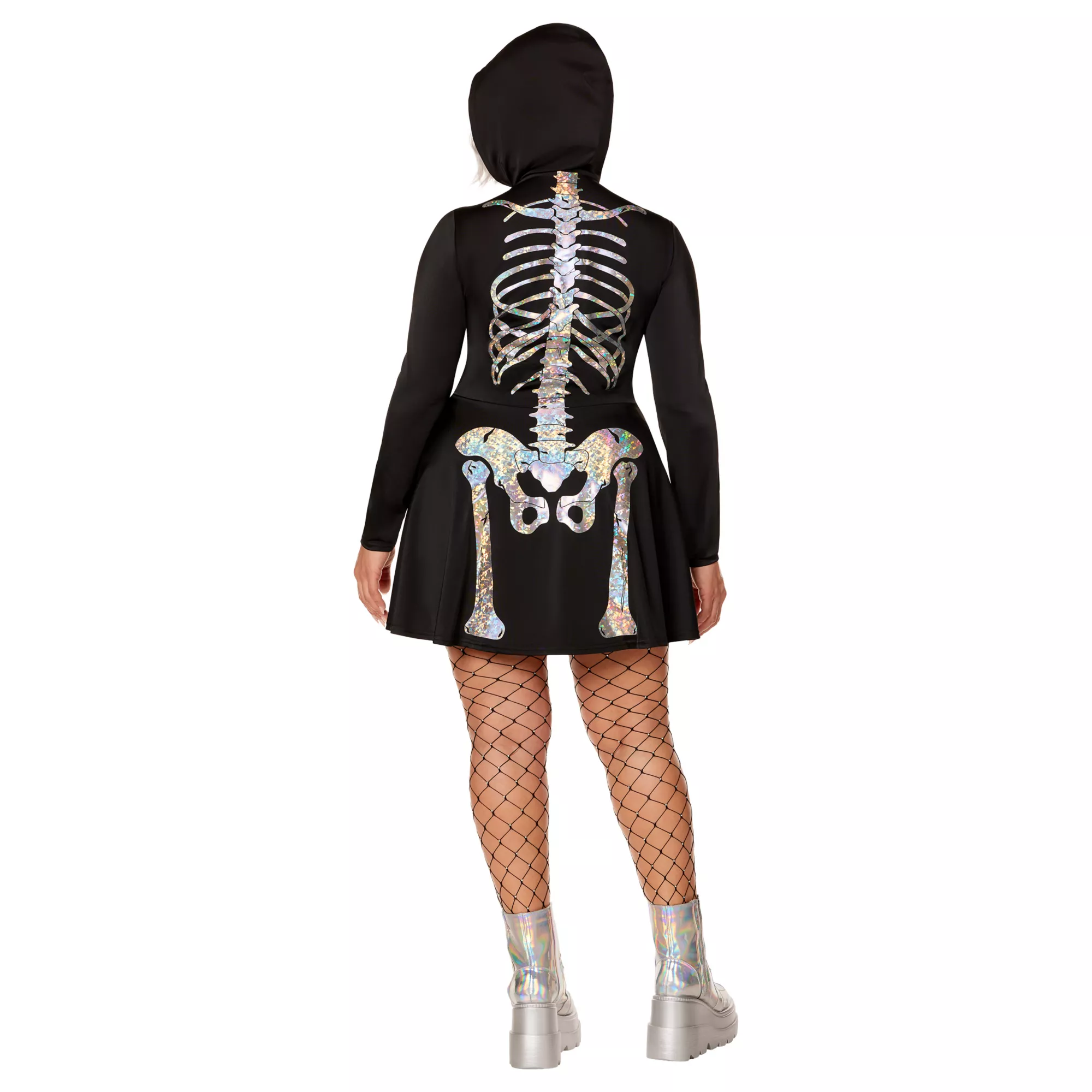 Going for a Halloween look that has the perfect blend of style, comfort, and spooky vibes? You can't go wrong with this Holographic Skeleton Hooded Dress. Match this product with some undead accessories or creepy makeup and take the look to the next level!