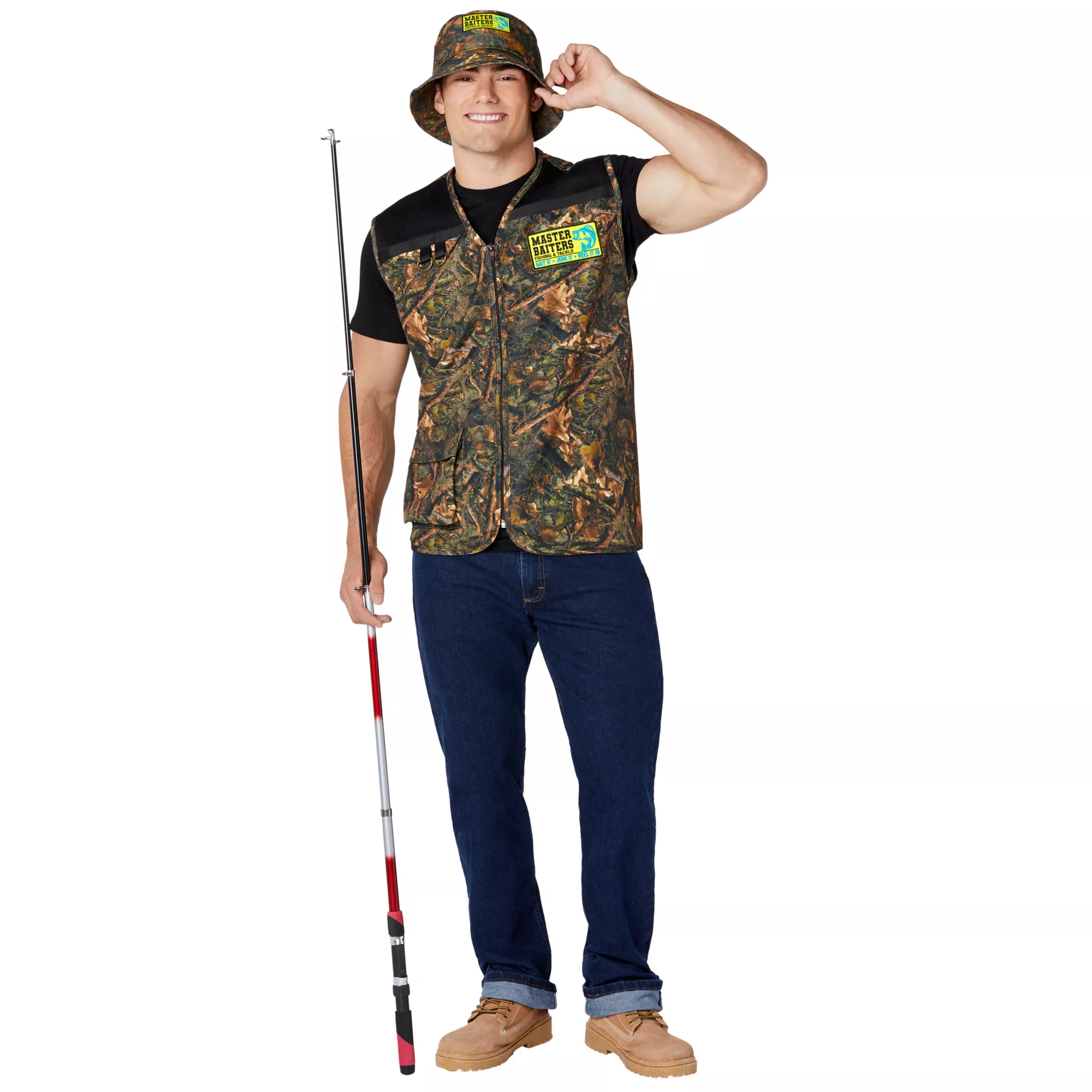 You might not catch any fish in this camouflage Master Baiters vest and bucket hat combo, but you're sure to catch a lot of laughs. This costume kit includes a relaxed camouflage bucket hat with a "Master Baiters" logo, and a matching zip-front vest with chest and back logos.