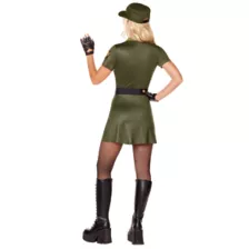 Ten-hut! Suit up in style with the Adult Military Wrap Dress Costume! You'll be prepared for anything when you slip into this ensemble which features an army green dress and a matching star-studded hat as well as gloves and a belt. For a look that's sure to wow on Halloween night, we've got your back! At ease, soldier.