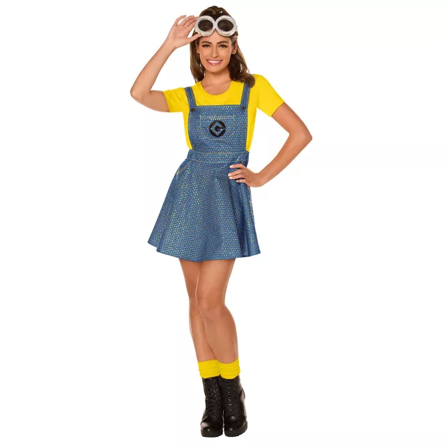 Rep your favorite franchise and shine bright at your next Halloween celebration when you wear this officially licensed Minions Bling Dress Costume. This incredible set comes complete with a yellow t-shirt, a bedazzled dress that features the Gru logo, and a pair of goggles to finish the look.