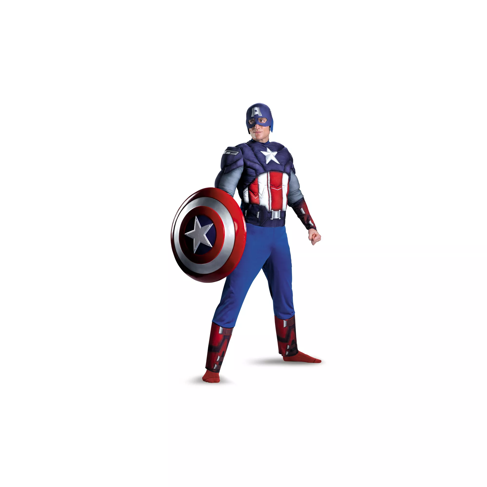 It takes muscle to defend the world against disaster and in this officially licensed Marvel Captain America Avengers classic muscle adult costume you've got what it takes. The red, white and blue muscle jumpsuit comes complete with a matching character headpiece.