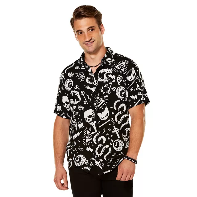 Represent the spooky side all year long with this fashionable Mystical Icons Button Up Shirt. This shirt includes skeletons, snakes and other creepy critters to warm your cold heart while you wear it.