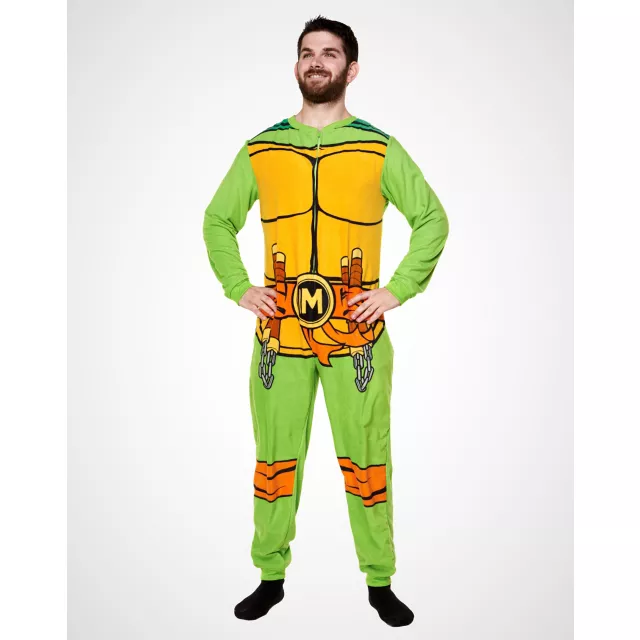 Are you a fun-loving jokester like your favorite ninja turtle? The officially licensed Teenage Mutant Ninja Turtles Men's Pajama Costume keeps you toasty warm and gives you Mikey's infamous orange belted look with nunchucks. This one piece is easy to wear; just zip up the front and it's Cowabunga time!
