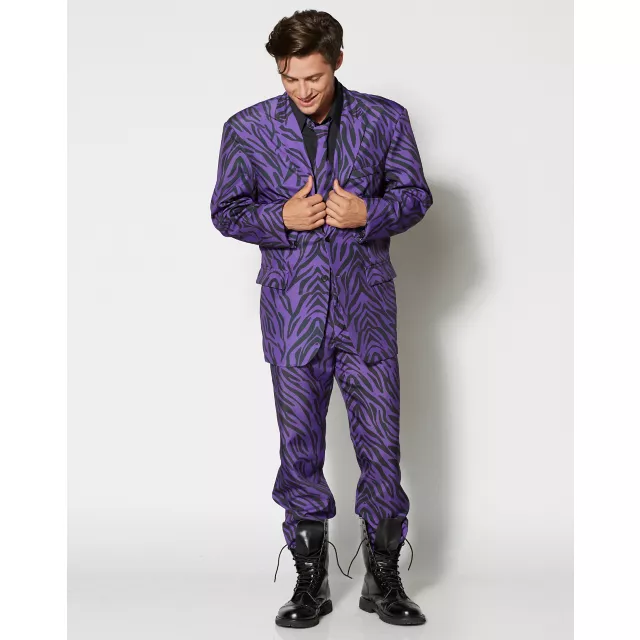 Pimpin' ain't easy, but you can do it in effortless style with this Pimp Party Suit. You're a man on the prowl in this zebra print suit which includes jacket, paints and tie. Let our your inner animal or own every corner of your block with this frisky men's suit. If you really want to hammer this look home add some bling, a cane and hat (sold separately). Pants come with 1 inches of extra material at the seam, so they can be perfectly tailored to your body.