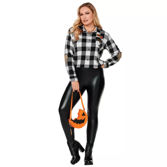 Celebrate your favorite horror movie in this official Trick 'r Treat Plus Size Flannel Shirt! This black and white checkered plus size shirt says "Trick 'r Treat" on the front in orange with a Sam lollipop graphic, Sam patches on the elbows, and "Always Check Your Candy" on the back, making it the perfect laid-back Halloween piece.