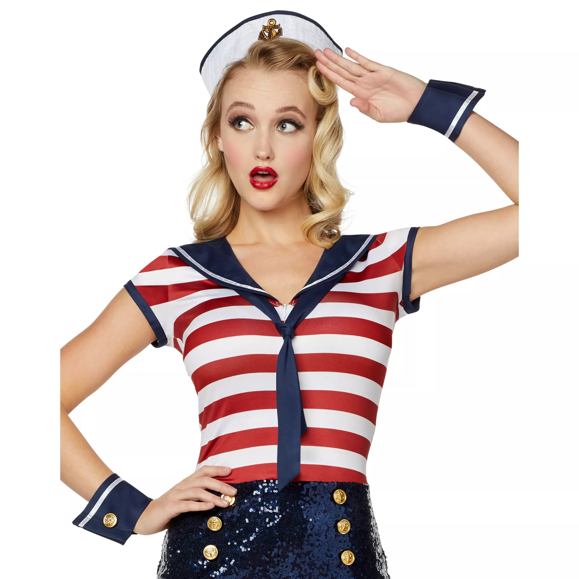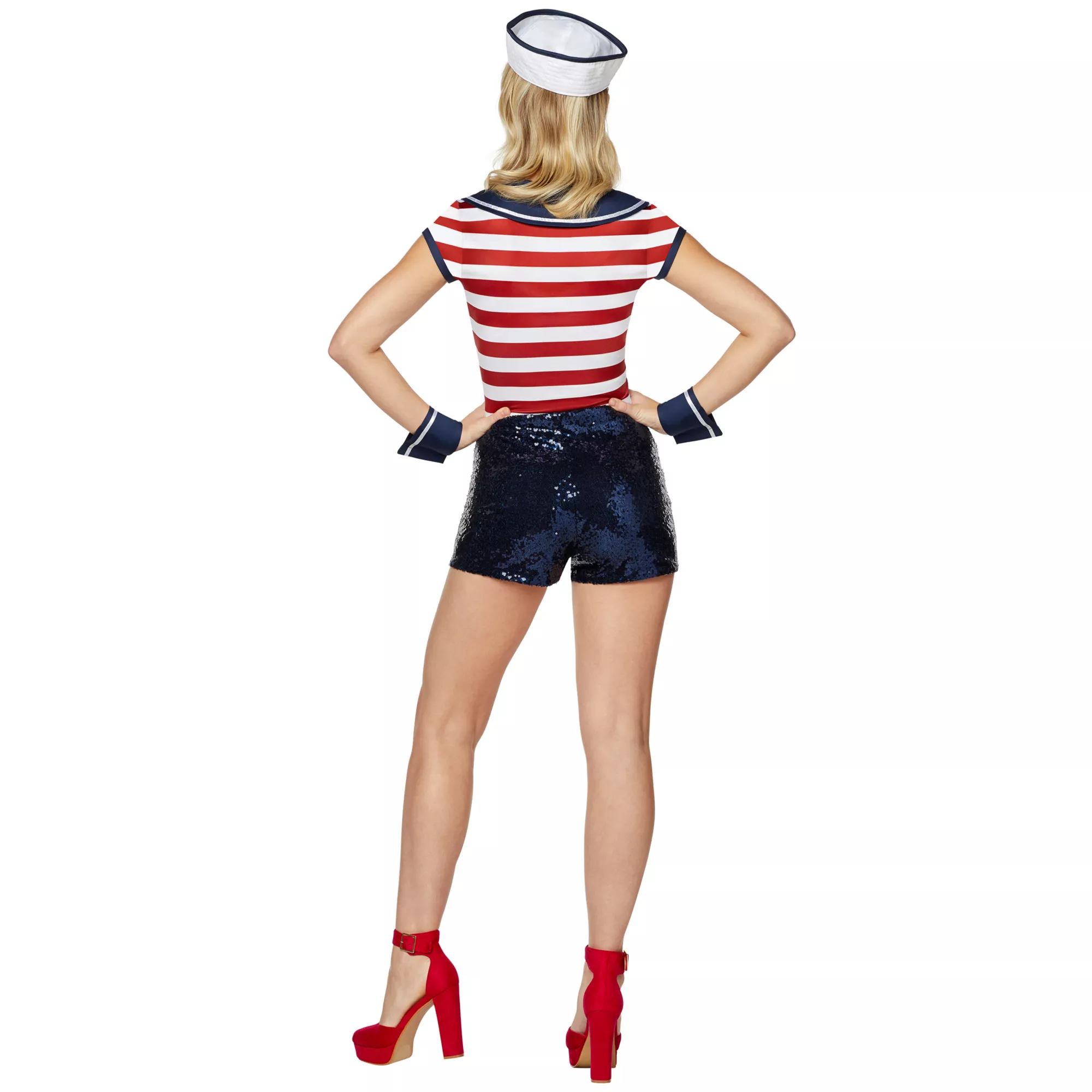 You’ll have everyone proud to be an American when you show up wearing this sequin sailor romper. With red, white and blue detail, you’ll be ready to sail through the costume contest with ease! The hidden zipper closure will ensure that you maintain the perfect fit all day long, and the goldtone faux buttons will add even more style to your look. Top it off with the included hat, attach your wrist cuffs and raise the anchor for sail!