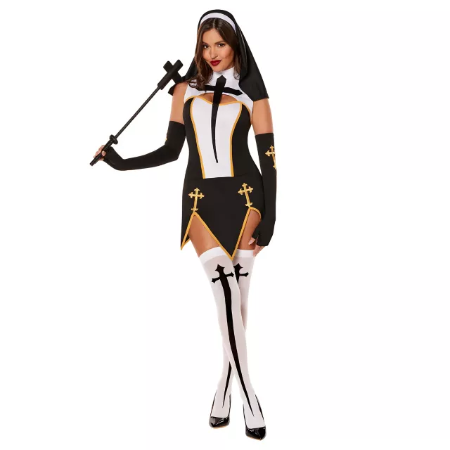 Bless the party with your presence this Halloween when you show up in this Sexy Nun Costume. Featuring a sexy black and white dress with gold details, matching arm warmers, bottoms, and a headpiece to finish it off, this is the perfect sexy costume you've always been praying for.