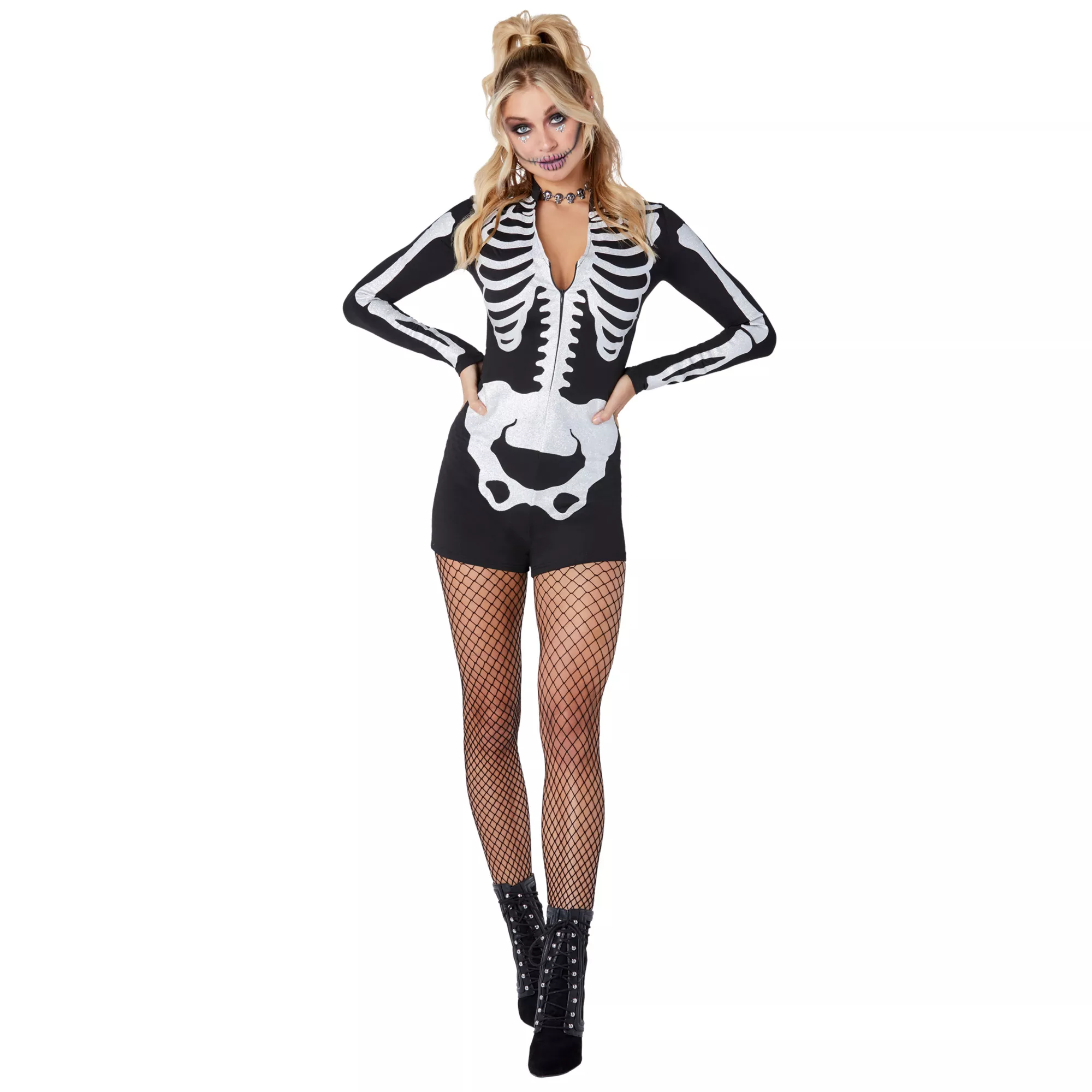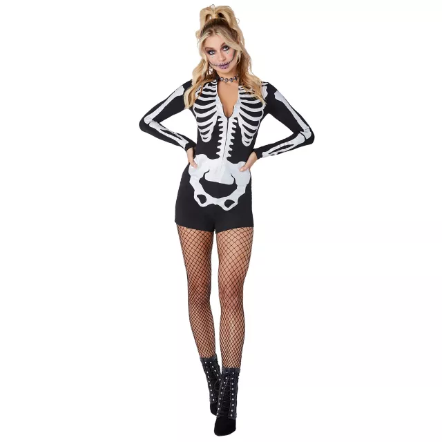 Get to rompin' around in this skeleton romper! Featuring long sleeves, shorts, and a bold skeleton print, this flattering romper will make you feel both spooky and cute. Pair it with your best black boots and haunting makeup (sold separately) for a beautifully bony look!