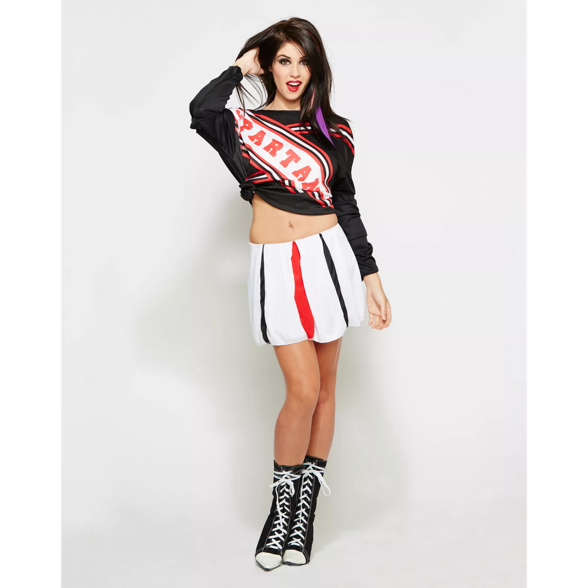 Show them what the perfect cheer looks like when you wear the officially licensed Saturday Night Live Spartan Cheerleader adult womens costume. Cheer on the chess team in this black, white and red top, complete with matching pleated skirt.