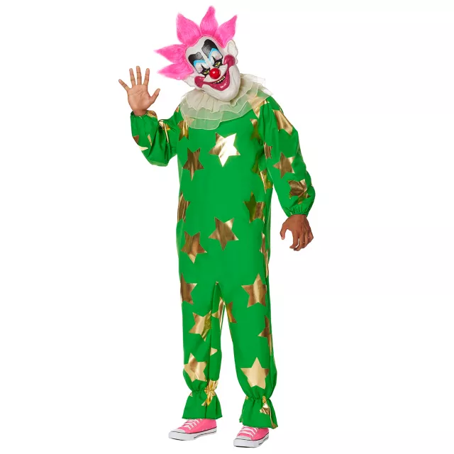 Become the sinister Spikey with this officially licensed Killer Klowns from Outer Space costume. This creepy clown getup includes a green jumpsuit covered in gold stars, a lively clown collar, and a menacing half mask with bright pink hair and a disturbing grin. Hop in the clown car! We're going for a ride.