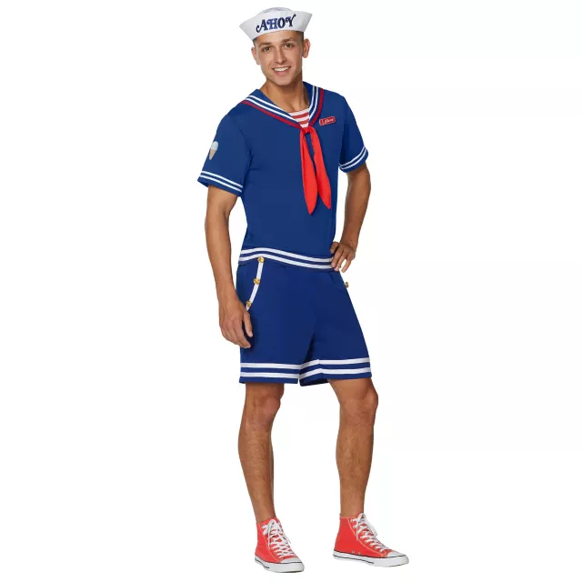 Ahoy! It’s time to grab some ice cream with this officially licensed Adult Steve Scoops Ahoy Costume, featuring embroidered patches to make this look your own. Get ready for a summer job with Steve Harrington in this uniform, a summer full of serving ice cream, sneaking Mike and his friends into the movies, and fighting life-threatening monsters. Sounds like a great summer, right..?