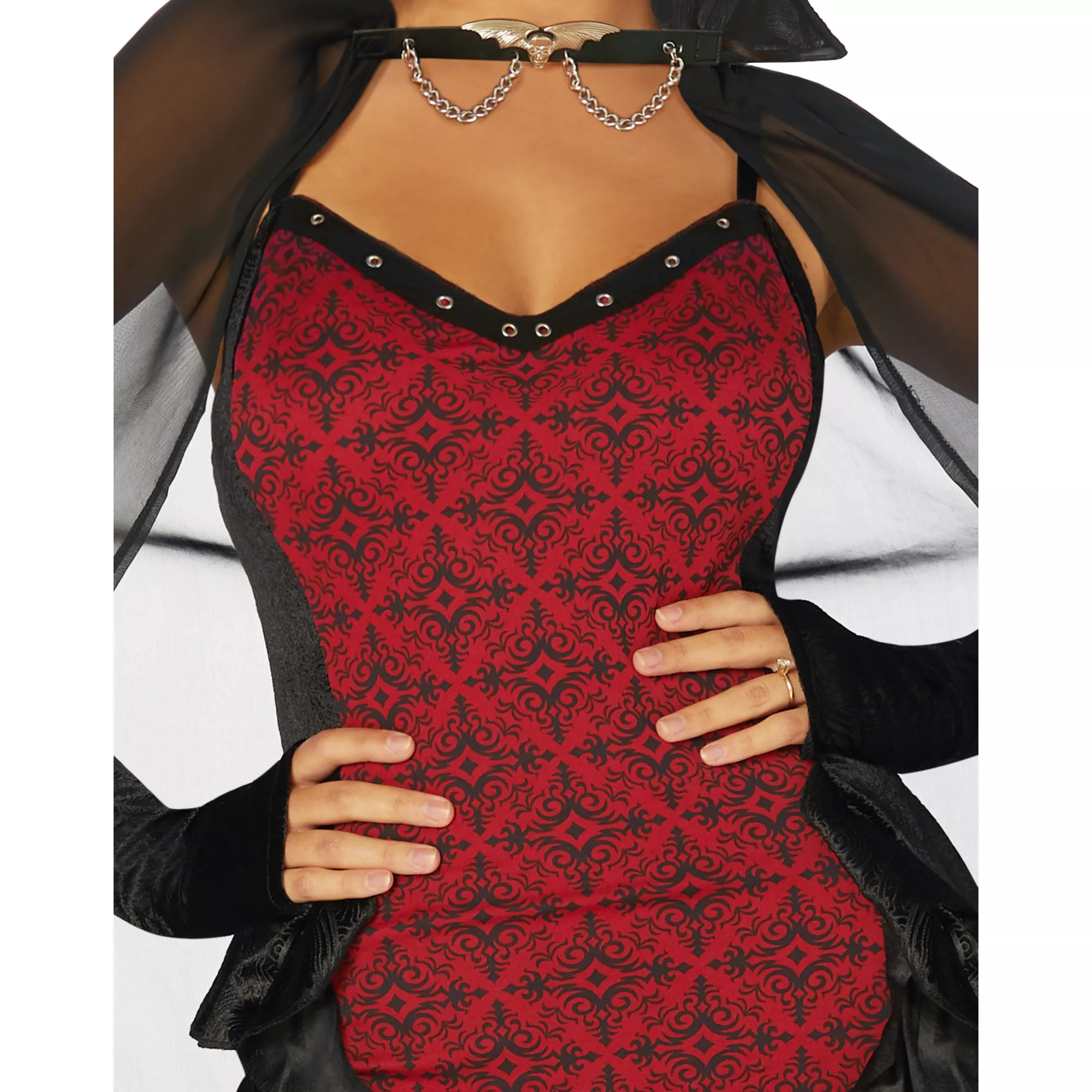 There's no better way to slay all night this Halloween than by rocking this Wild for Blood Mistress Costume. This outfit features a red and black dress with a hi-lo hemline and flayed details, a black cape with an intricate bat chain clip, and arm warmers to keep you looking fly. You'll love hunting for mischief in this stylish costume this Halloween.