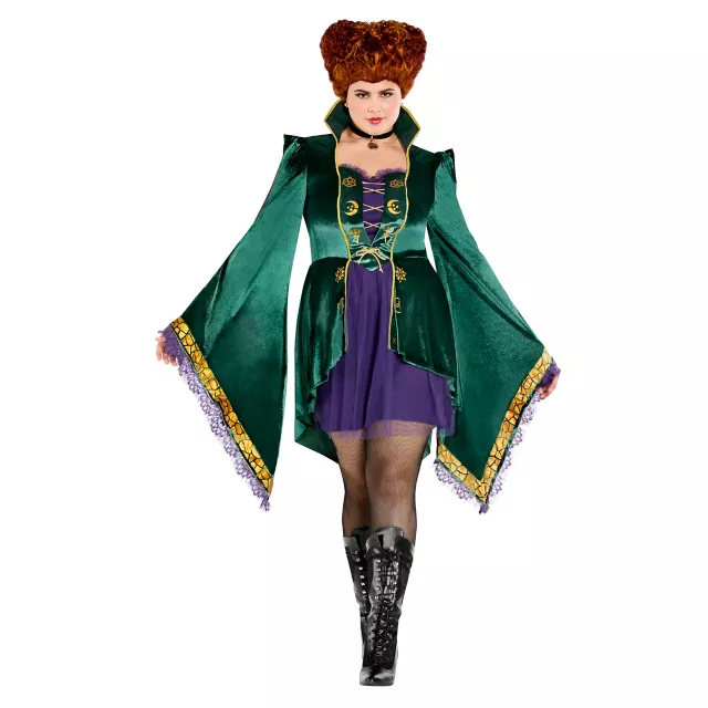 All the way from Salem comes this officially licensed Winifred Sanderson Dress, featured in Disney’s Hocus Pocus! This devilish dress displays brilliantly colored green and purple fabric adorned with gold detailing that only a real witch could pull off! Grab your bewitching sisters and get ready for an enchanting night of fright! Take a walk on the wicked side with this vexing villainess’s dress, available exclusively at Spirit Halloween.