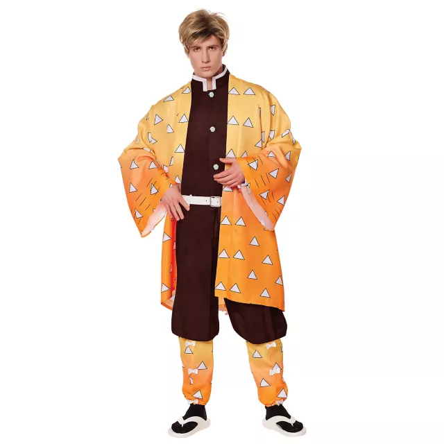 Show off your fandom for Demon Slayer and send demons running with this Adult Zenitsu Costume! This officially licensed fit includes a black and white jumpsuit, an orange kimono, matching shin wraps, and a belt. Once you slip into this epic ensemble, everyone will know which anime is your absolute favorite!