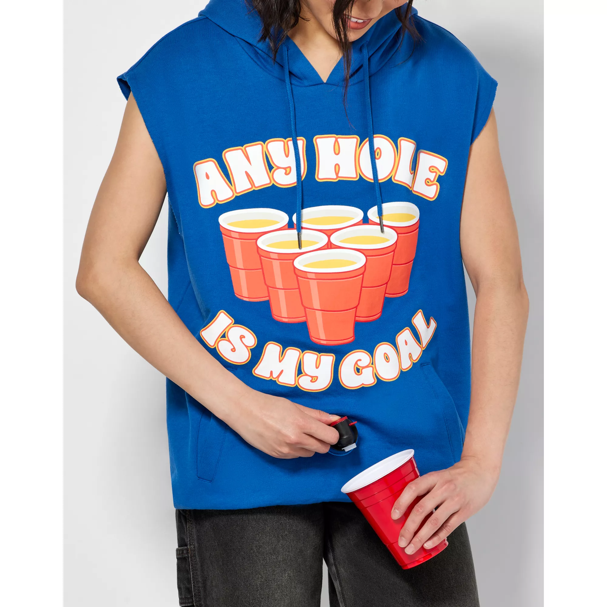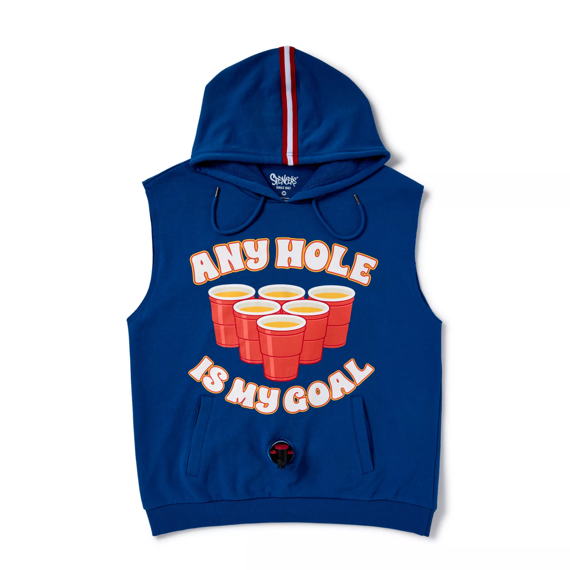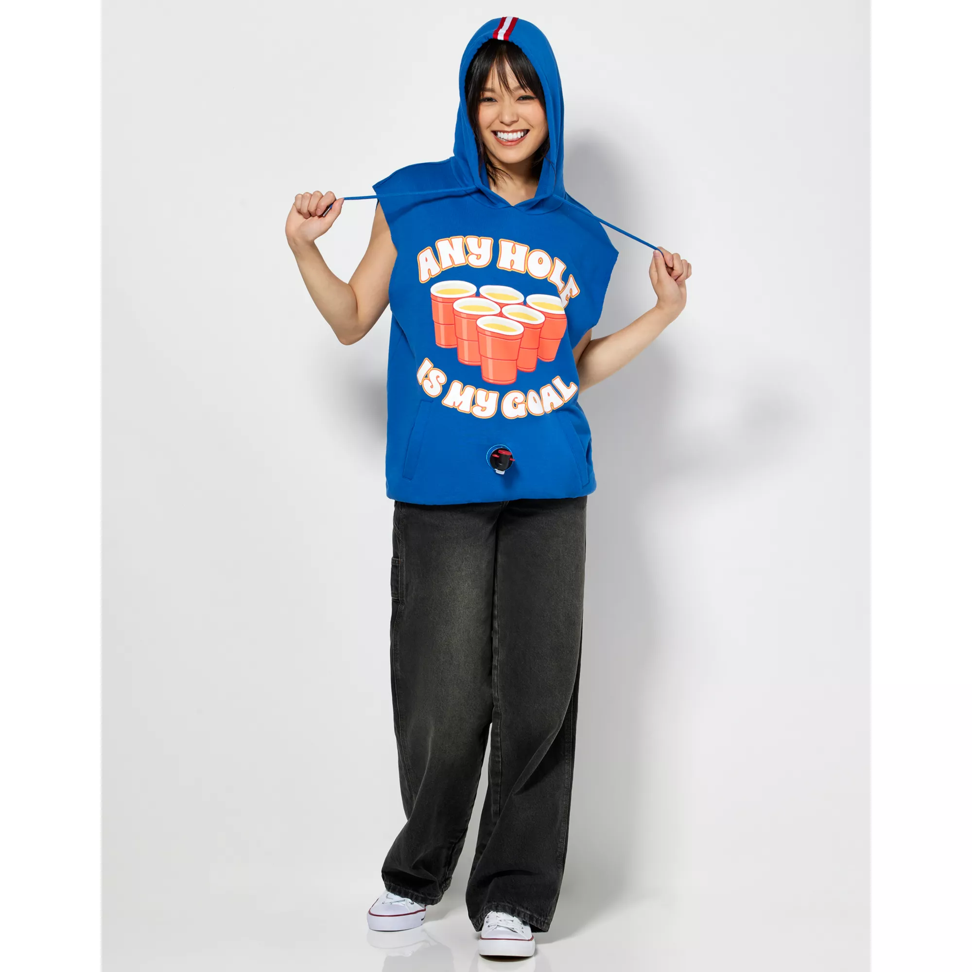 Leave no doubt who the pong champ of the house is when you sport this Any Hole is My Goal Sleeveless Hoodie with Drinking Pouch to the next house party. Featuring a beer pong graphic with a secret hidden drinking pouch and spout attached to the front pocket, this sleeveless hoodie is the perfect choice for any party! Get ready to run the table while rocking this sweet hoodie.