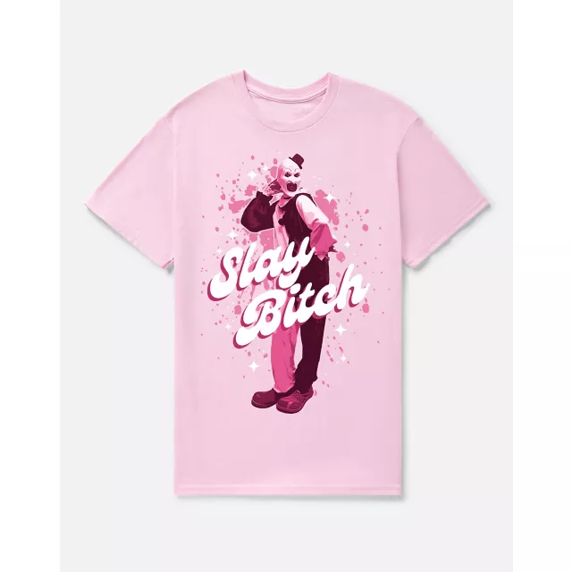 Talk about gore power! Create a look that'll have hearts racing with this officially licensed Art the Clown Slay Bitch T Shirt. Designed with retro font, groovy pink hues, and a graphic of Art sassy and poised to kill, this tee is sure to have you feeling nothing less than terrifying. Rock it at your next horror movie marathon night or incorporate it into your everyday style for an outfit that makes every day feel like Halloween.