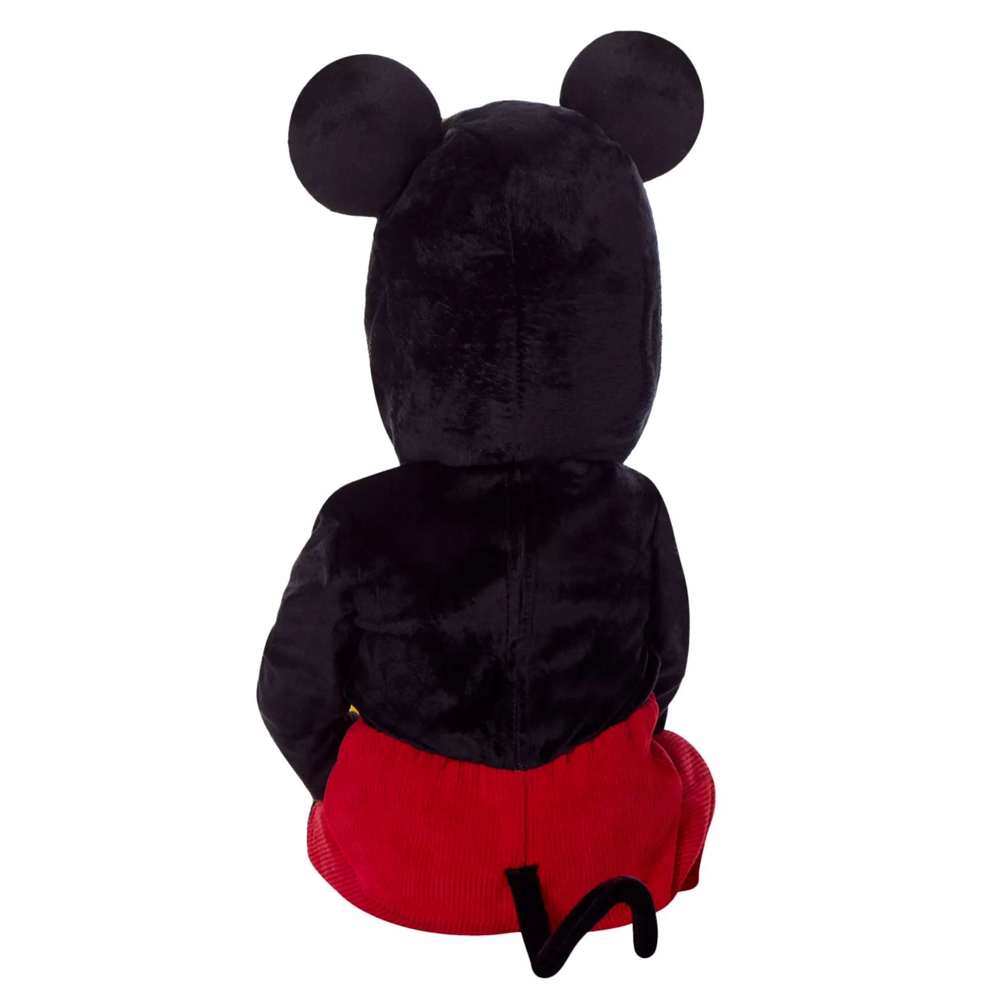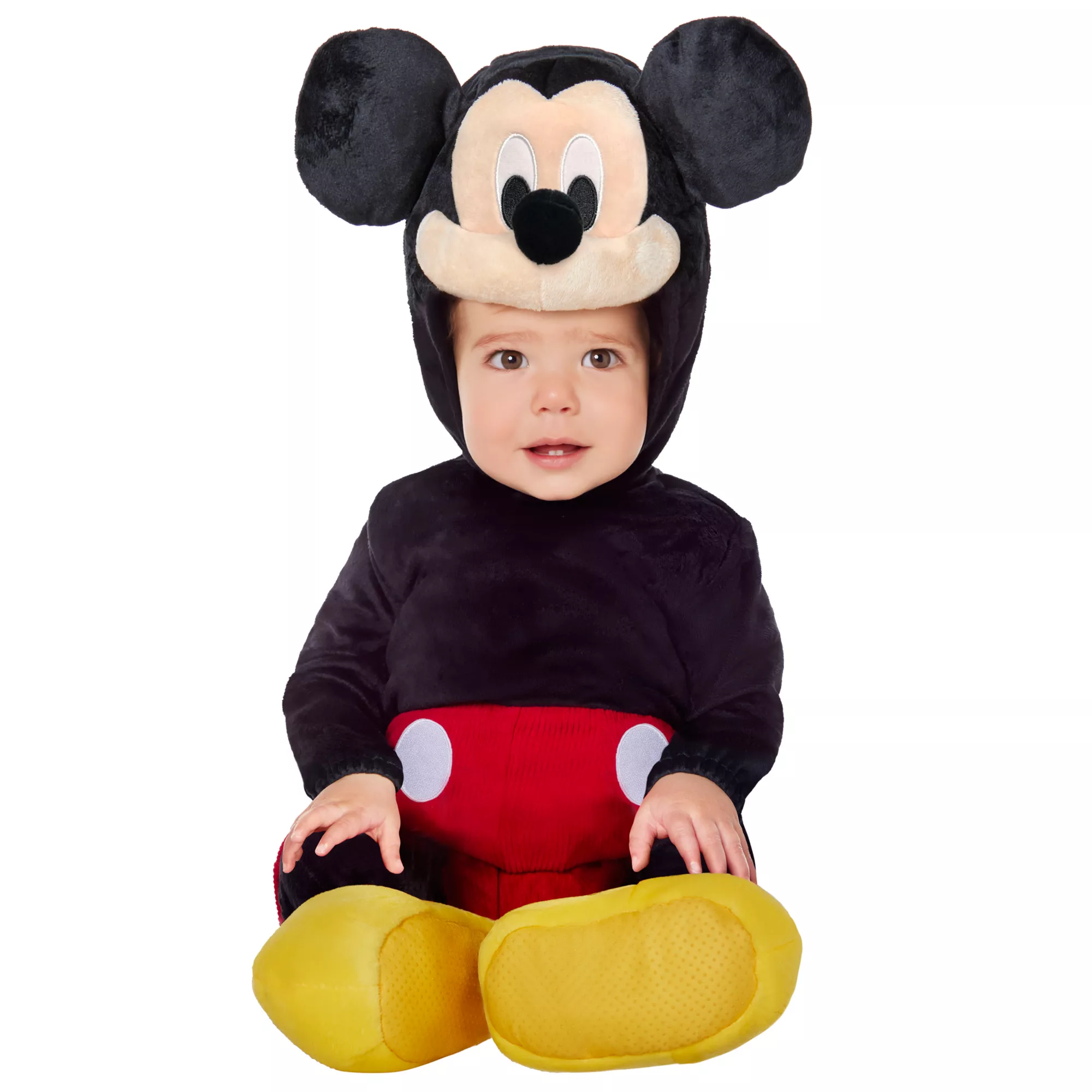Join Mickey Mouse and friends in this officially licensed costume! Your little one will look positively precious in this black jumpsuit with red shorts, an attached tail, and yellow shoe covers. A soft hood features Mickey's infamous mouse ears and friendly face!