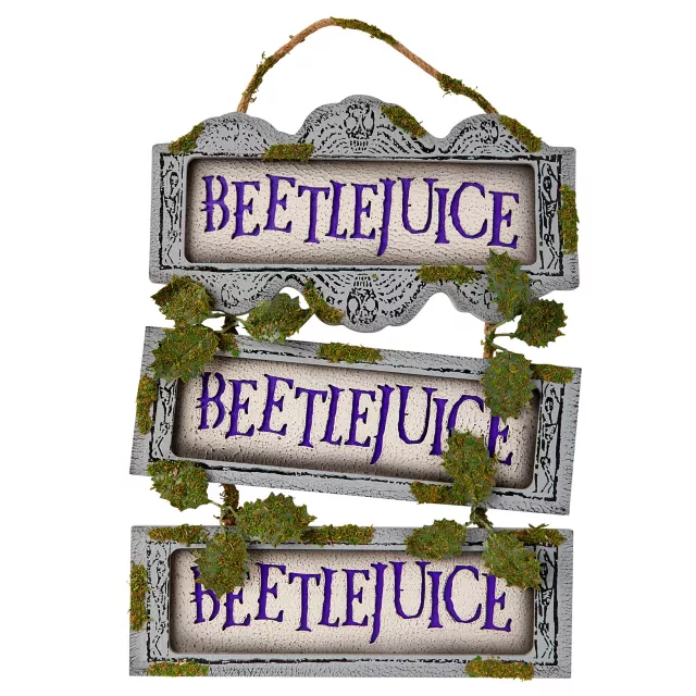 Hang this official Beetlejuice Ladder Sign and show that you're a true fan! This stylish sign says "Beetlejuice" (three times!) in purple on each of its panels surrounded by images of skeletons, along with fake tree leaves for extra style. Make sure everyone knows that you can't get enough of Beetlejuice with this fun sign.