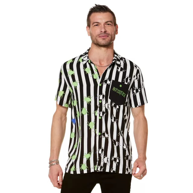 Big fan of Beetlejuice? Everyone will be calling you "The Ghost with the Most" when you rock this stylish button down shirt. Featuring the signature Beetlejuice black and white striped design along with creepy printed spiders, this top is perfect for any fan!