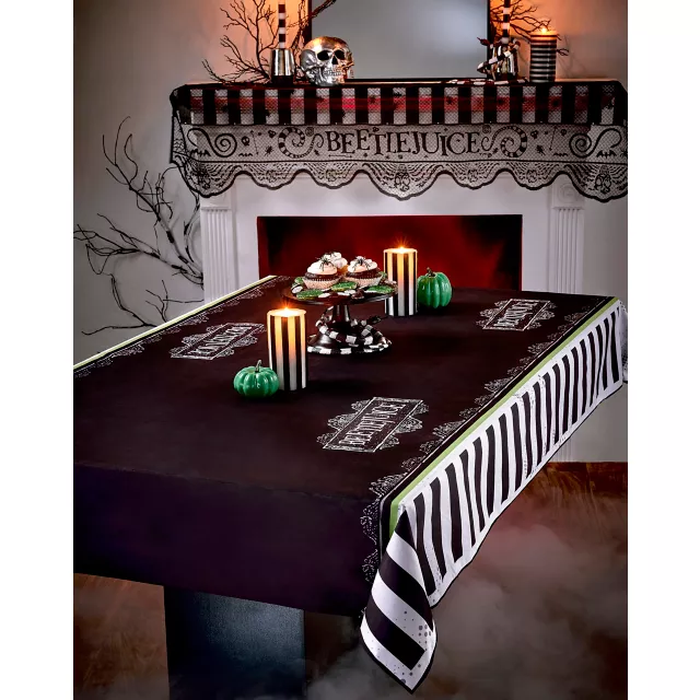 Transform your table with this officially licensed Beetlejuice Tablecloth! This tablecloth has BJ's signature stripes so there will be no doubting your inspiration from the ghost with the most.