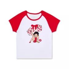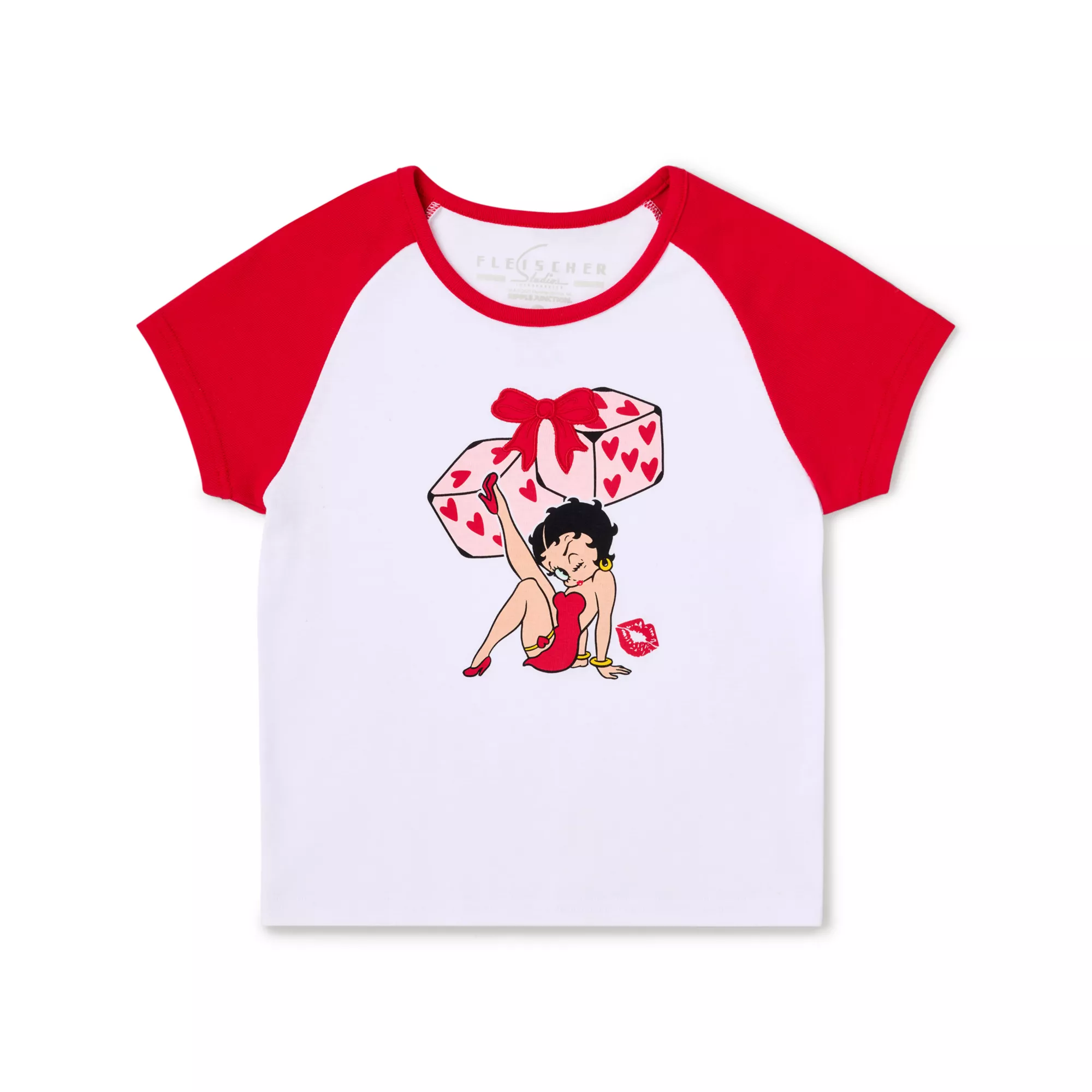 Add a stroke of luck to your next casual look with this officially licensed Betty Boop Dice Baby T Shirt. Featuring Betty Boop on the front with a pair of hear themed dice, in this tee you'll be feeling lucky and always ready to show your fandom for Betty. With a baby tee size fit this tee is a sure bet to have you feeling cute.
