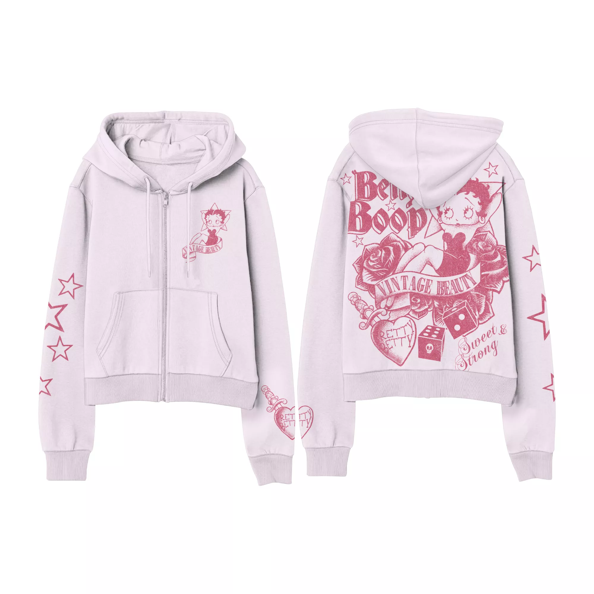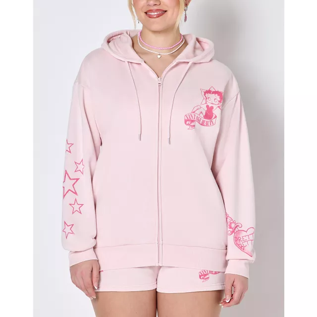 Show off your favorite fun pop culture character with this pink Betty Boop zip hoodie! This stylish hoodie is the perfect way to stay warm while making a fashion statement.