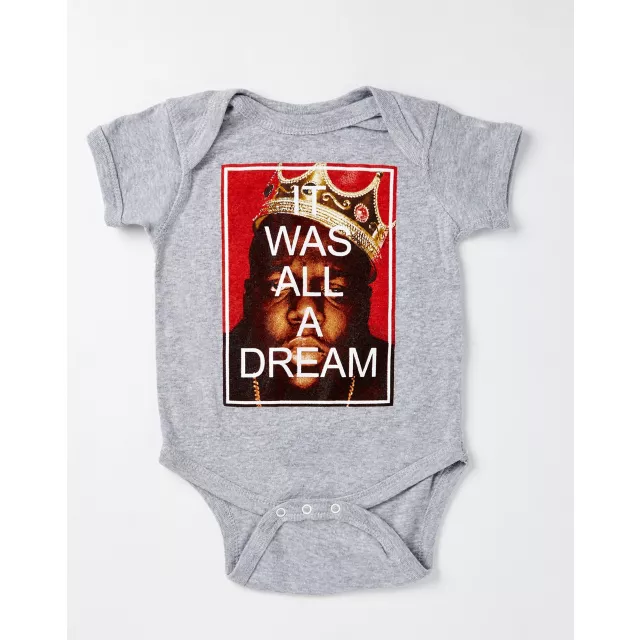 Let your baby rock the look of The Notorious B.I.G. when you put them in this Biggie baby bodysuit. Featuring a picture of the king himself with one of his famous lines, "it was all just a dream" in white letters, this bodysuit is great for any parents who love Biggie Smalls.