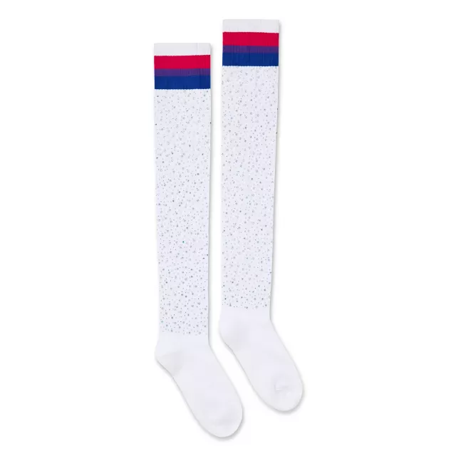 Let your love shine when you sport these exclusive Bisexual Pride Rhinestone Knee High Socks! Made with glimmering rhinestone accents and pink, purple, and blue stripes, these socks will have you wearing your pride in style.