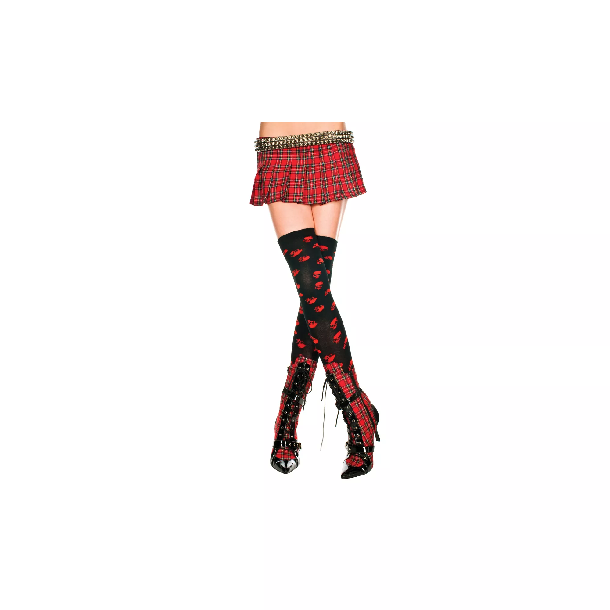 Add a punk edge to your look in the Black and Red Skull Thigh High. These thigh highs have a black base and are littered with red skulls, ensuring a scary and sexy Halloween.