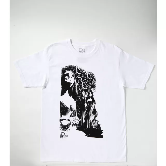 Make your casual style unforgettable with this black and white Corpse Bride t shirt! Featuring intricate artwork of Victor and Emily, this graphic tee is perfect for any Corpse Bride fan.