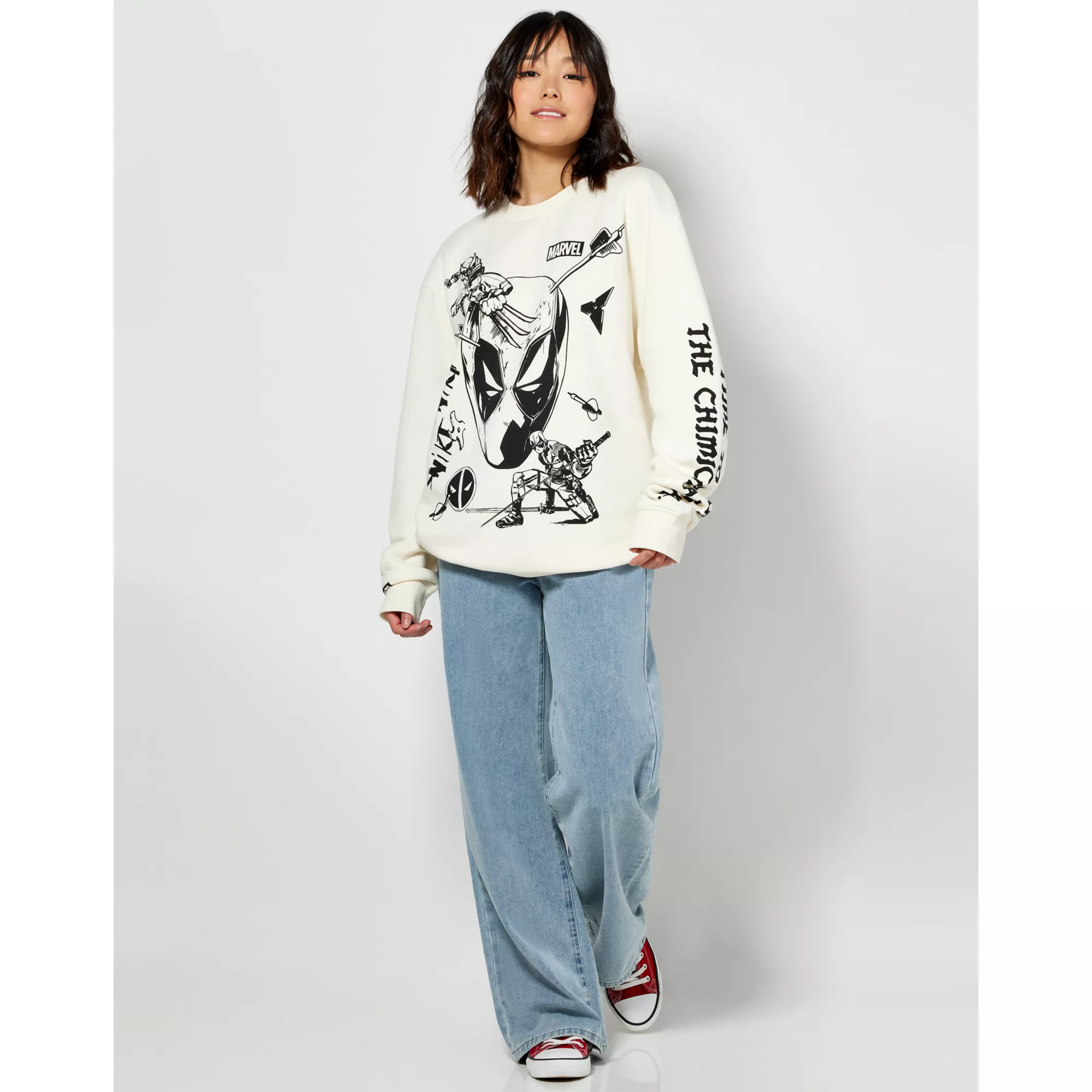 Join the Chimichangas with this officially licensed Black and White Deadpool Crewneck! This is the perfect piece for the all the anti-heroes out there.