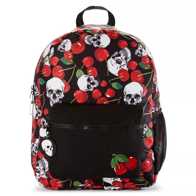 Show the world your sweet and scary sides when wearing this Black Cherry Skull Backpack. This roomy backpack features one large front zipper pocket, one netted side pocket, one internal laptop sleeve, and an epic cherry skull montage design.