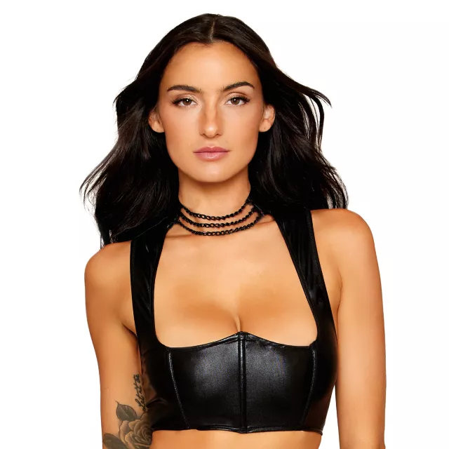 This stunning black harness corset is the perfect hot look for the bedroom or a steamy night out! This body-hugging sexy corset accentuates your curves and will ensure that all eyes are on you wherever you wear it.