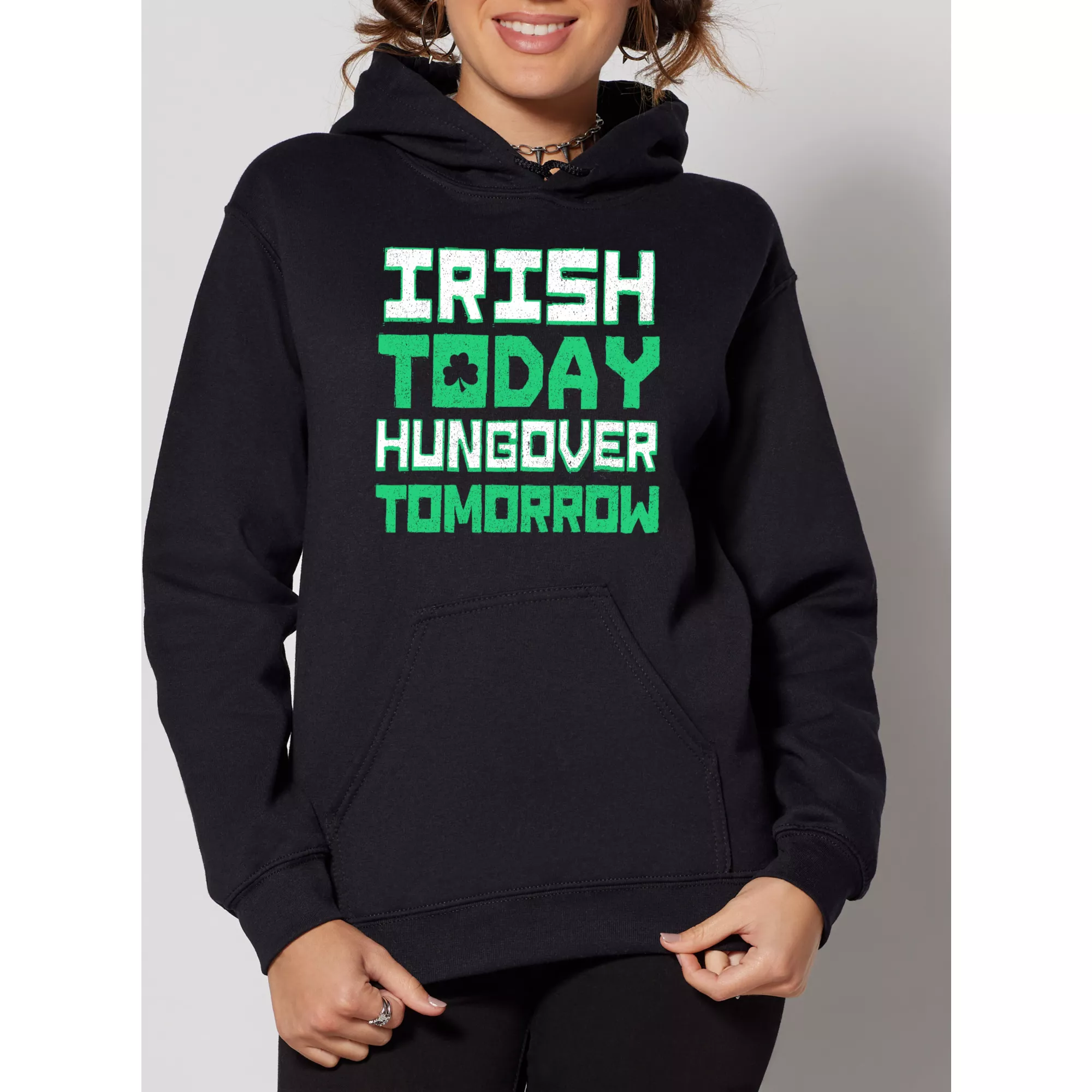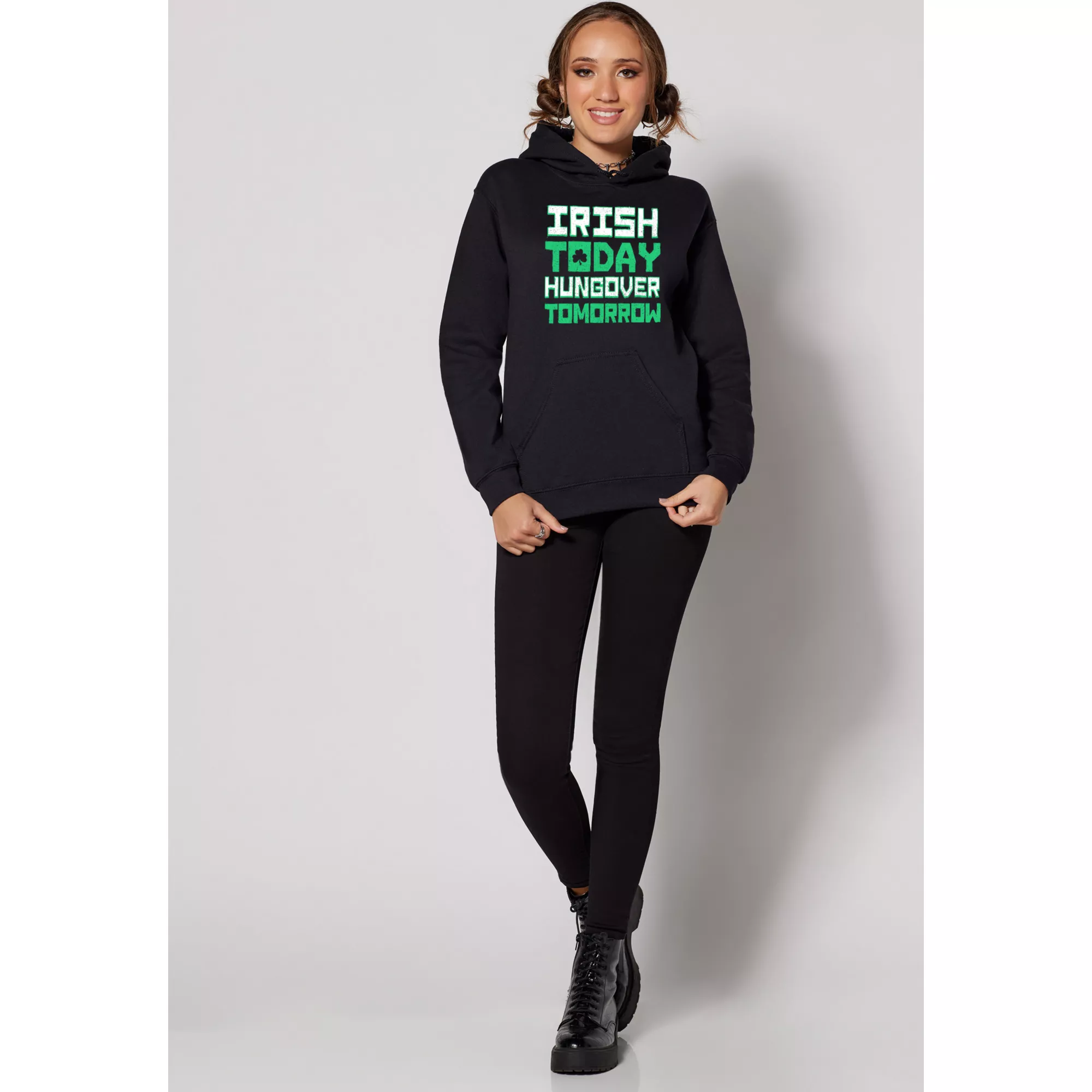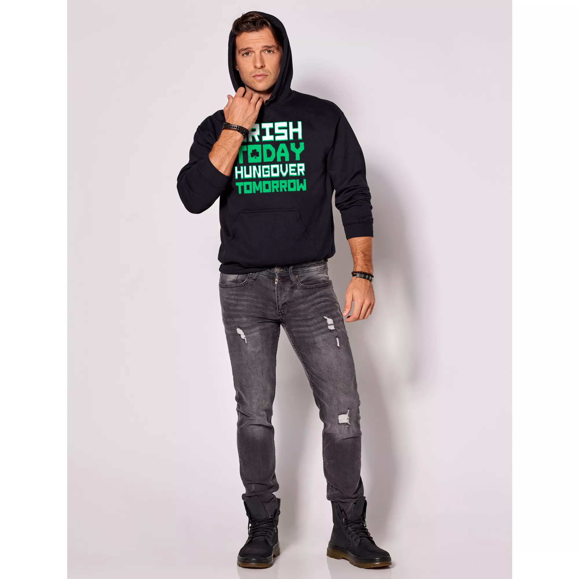 Irish today, hungover tomorrow. Stay warm while you party this St. Patrick's Day when you're wearing this cozy Black Irish Today Hungover Tomorrow Hoodie.
