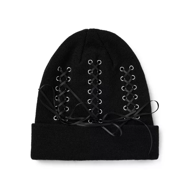 Stay warm in style with this Black Lace-Up Cuff Beanie Hat! Made with super soft fabric and cute lace-up accents, this beanie is a must for your next look.
