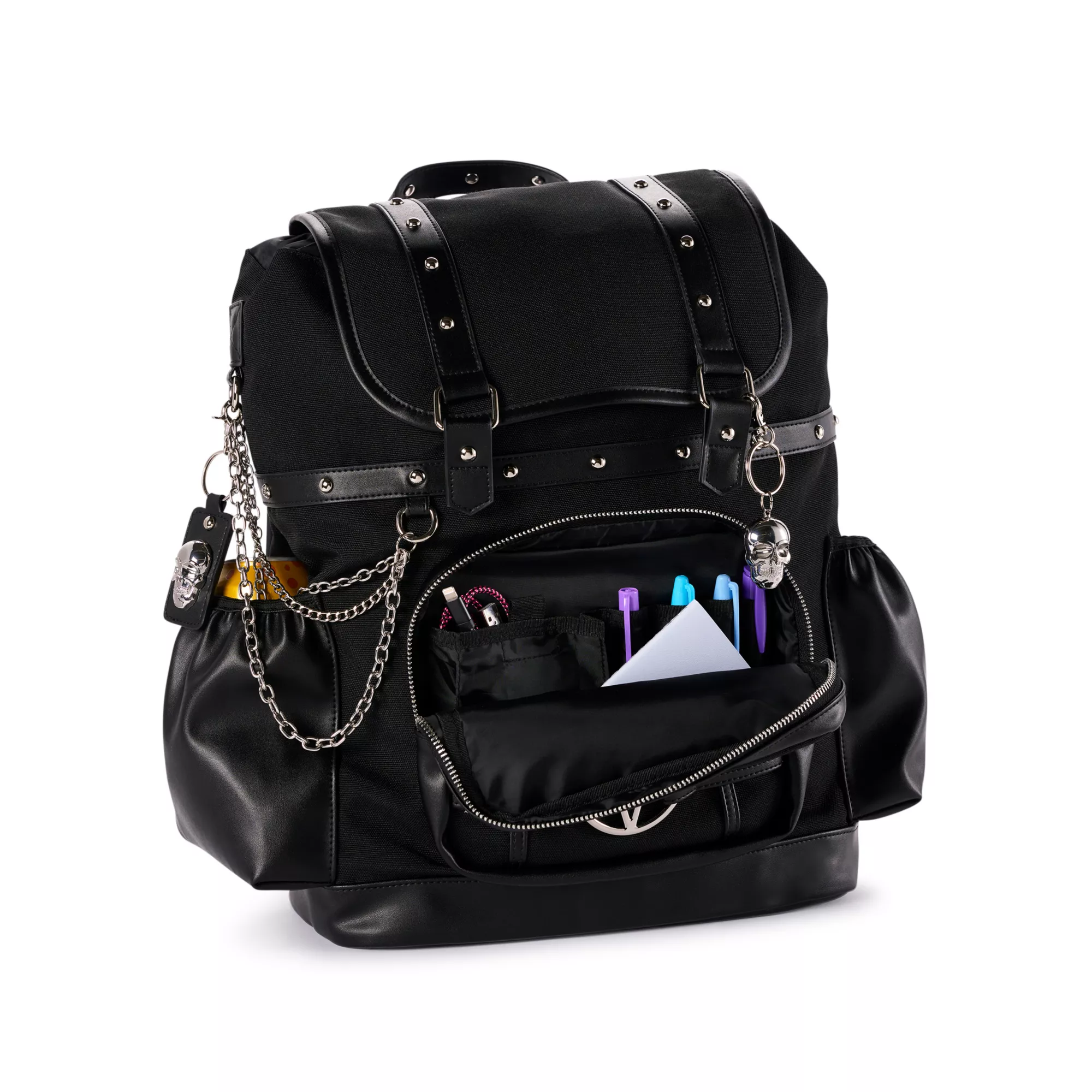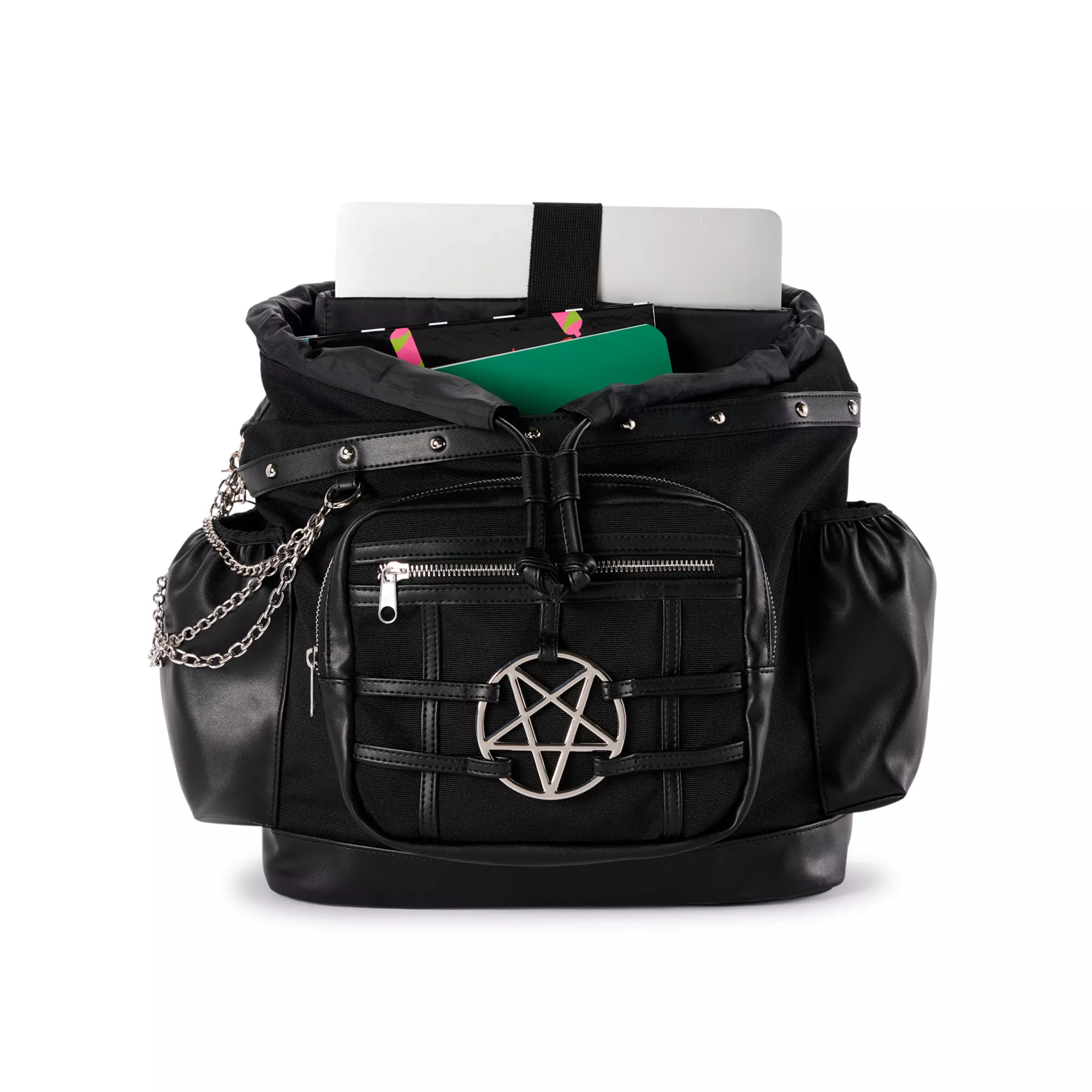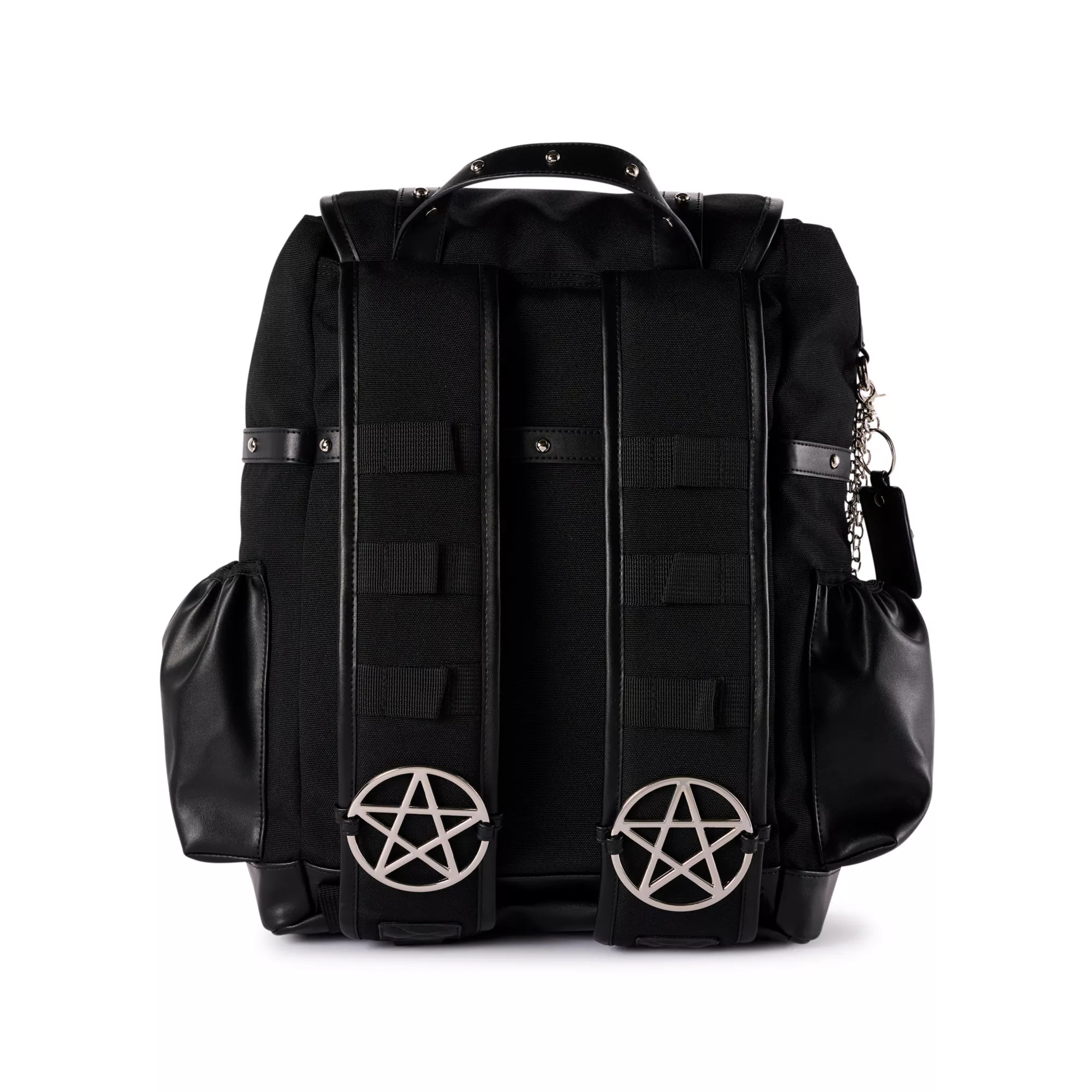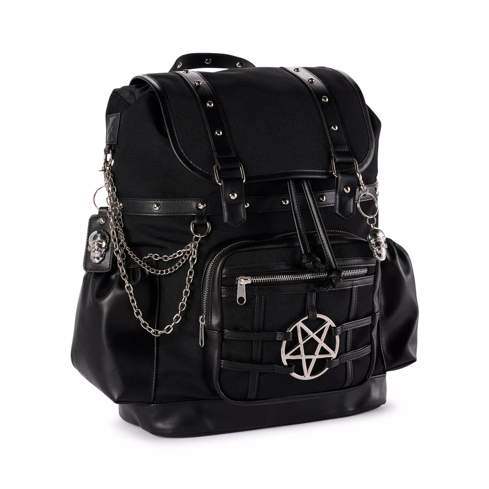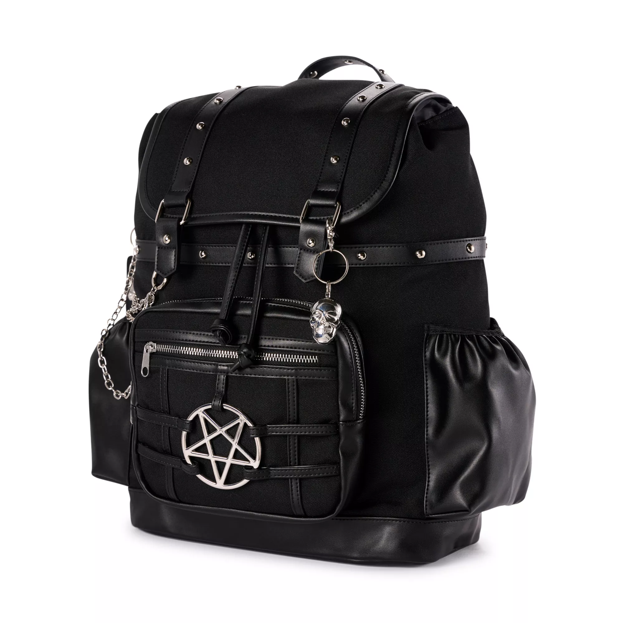 This black pentagram rucksack backpack has it all! Chains, pentagrams, and even an attached skull keychain set this backpack apart from the rest. Its padded, adjustable straps are accented with two silvertone pentagrams, and matching silvertone studs adorn the front.