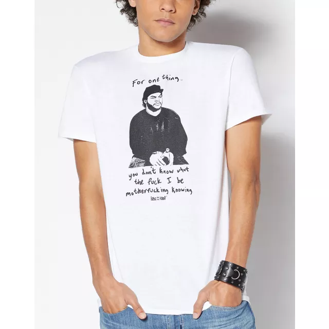 Rock a classic movie quote with this Boyz in the Hood T Shirt! This white tee graphic feature the quote "For one thing...you don't know what the fuck I be motherfucking knowing." If that ain't boss, we know know what is.