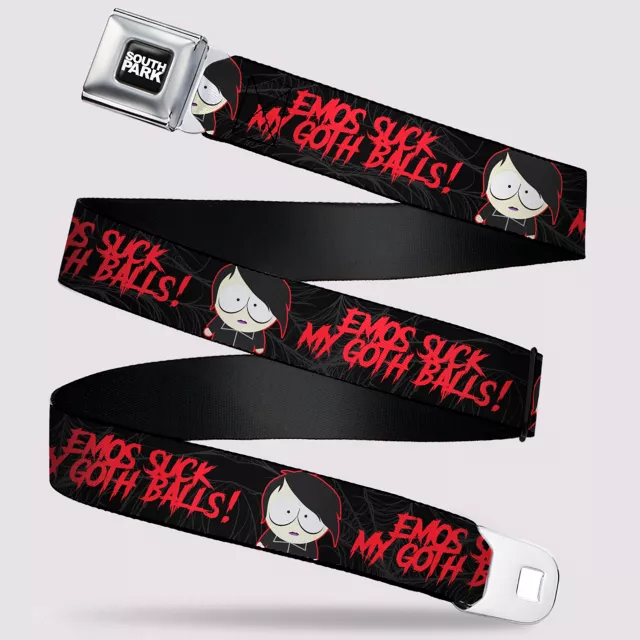 Make everyone laugh when you wear this Buckle-Down South Park Emos Suck My Goth Balls seatbelt belt! This belt is the perfect accessory for any South Park fan.