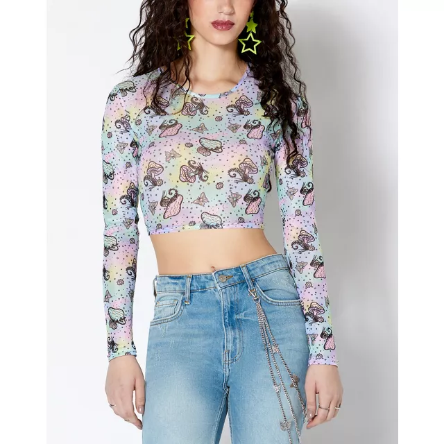 Strut your stuff in style when you sport this Butterfly Mushroom Mesh Crop Top! Complete with dreamy pastel hues and charming illustrations, this top will have you turning heads and stealing hearts wherever you go. Wear this piece to your next rave, festival, or spring fling!